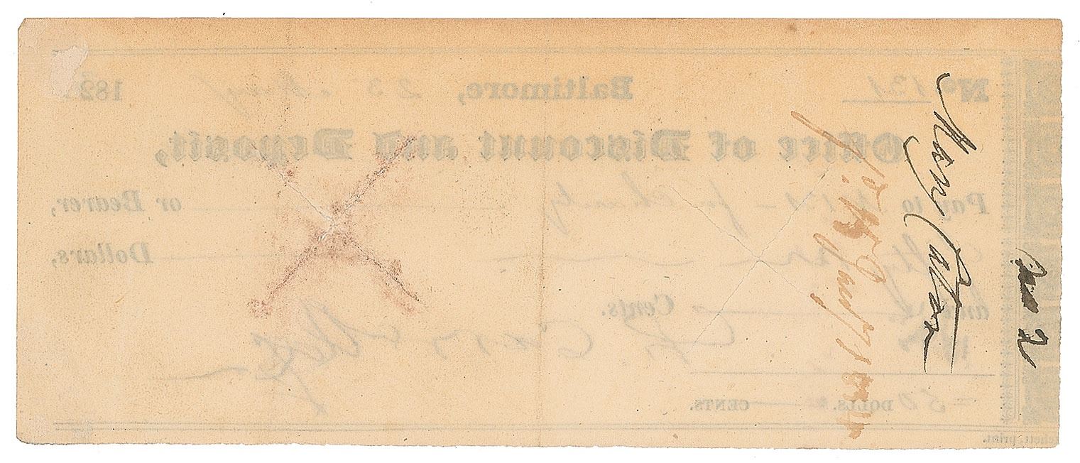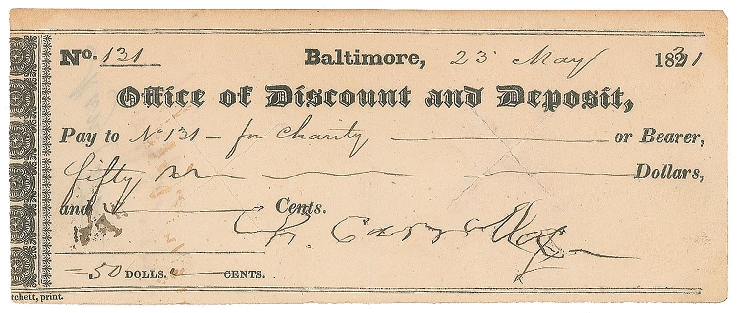 Baltimore Office of Discount and Deposit check, 6.5 x 2.5, filled out in another hand and signed by Carroll, "Ch. Carroll," payable to "No. 131—for Charity" for $50, June 23, 1831. In fine condition.