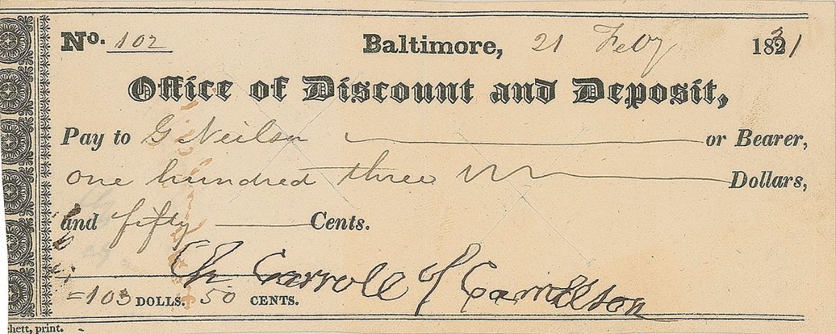 Signer of the Declaration of Independence from Maryland (1737–1832) who was the longest-lived among his colleagues. Baltimore Office of Discount and Deposit bank check, 6.5 x 2.5, filled out in another hand and signed by Carroll, “Ch. Carroll of Carrollton,” payable to G. Neilson for $103.50, February 21, 1831. Affixed at the top edge to a slightly larger cardstock sheet. In fine condition.