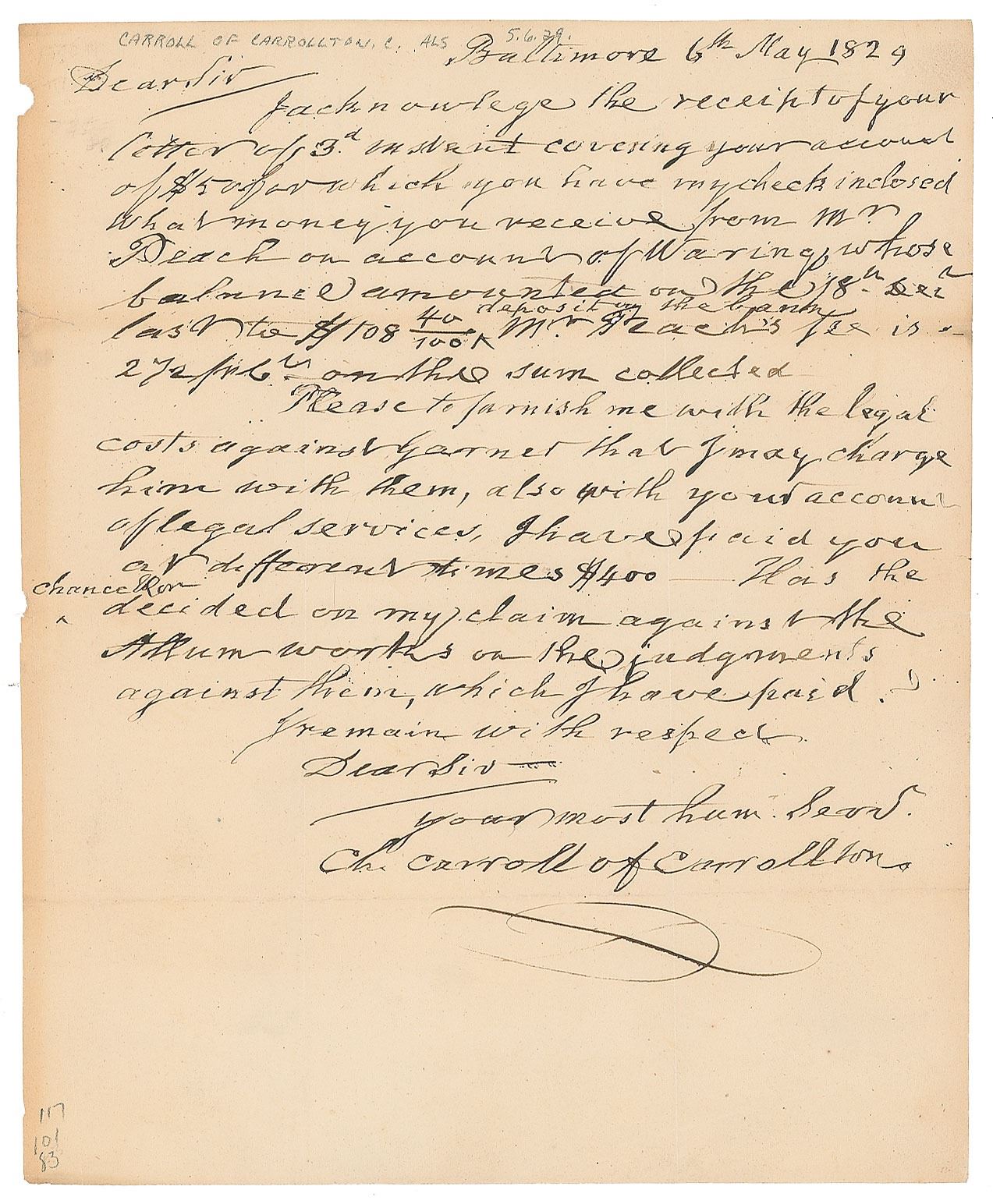 Signer of the Declaration of Independence from Maryland (1737–1832) who was the longest-lived among his colleagues. ALS signed “Ch. Carroll of Carrollton,” one page, 8 x 9.75, May 6, 1829. Letter to a gentleman, written from Baltimore, in part: "I acknowledge the receipt of your letter…covering your account of $50 for which you have my check inclosed…Please to furnish me with the legal costs against Garner that I may charge him with them, also with your account of legal services. I have paid you at different times $400." In fine condition, with light toning, and two small chips, along the left edge.