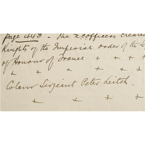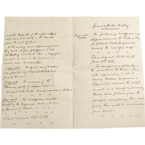 <B>Charles G. "Chinese" Gordon Archive.</B></I> Four pieces. The archive includes two letters from General Gordon dated March 23, 1872 from Galatz. The first letter is to Peter Leitch from Gordon expressing his feelings about Leicht leaving. Gordon writes, "<I>It is a great mistake and loss to us. Your age would give us at least 10 years more good work and we would gain by your experience..."</B></I> The other letter on the opposing side of this letter serves as a recommendation for Leicht reading in part, "<I>I can testify to his integrity, zeal and ability in the performance of his duties...I regret extremely by his leaving the service which he has so well and faithfully acquitted himself.</B></I>" Both letters are signed by Gordon. The other two items in the archive are a marriage license dated July 27, 1899 between Charles Tye and Harriet Leicht. This certified copy is dated Dec. 30, 1915. Harriet was Peter's widow. The fourth item is a list of written extracts from "Connolly's History of the (Royal Engineer) Royal Sapper and Miners and General Porters' history of the Corps of Royal Engineers. Written on Royal Engineer Horseguard official letterhead with an embossed seal. The excerpts are about the construction of a battery, "<I>The added work was partly constructed in the day under fire as was also the laying of the platforms - Corporal Peter Leicht promoted to Sergeant (was the principal officer in charge of the huts sent from this country to the Armied; and severely wounded in the assault on the Redan on 8. Sept. 1855)...</B></I>" Also mentioned is the Siege of Sebastopol, "<I>The Carpenters, 16 in number were chosen men under Leitch, the master carpenter of the night attack, who had been daily in the trenches from the end of June. With energy never before surpassed they laid 4 gun platforms in No. 22.</B></I>" The document goes on to talk about Leitch's wound to the head after a storming part of sappers, the Knights of the Imperial Order of the Legion of Honour of France. And the Victoria Cross." Colonel Leicht received the Victoria Cross on June 18, 1856 for gallant deeds performed during the eventful siege. The details of his gallantry read, "<I>When after approaching it with the leading ladders, he formed a Caponniere across the ditch, as well as a ramp, by fearlessly tearing down gabions from the parapet, and placing them, and filling them until he was disabled from wounds.</B></I>" The Victoria Cross is the highest and most prestigious award for gallantry in the face of the enemy that can be awarded to British and Commonwealth forces. His Victoria Cross is displayed at the Royal Engineers Museum. Fine condition overall.