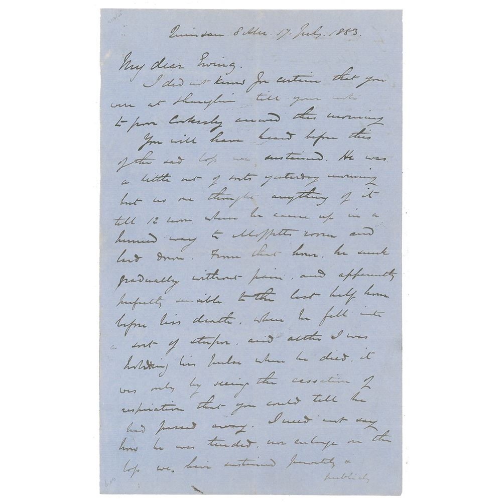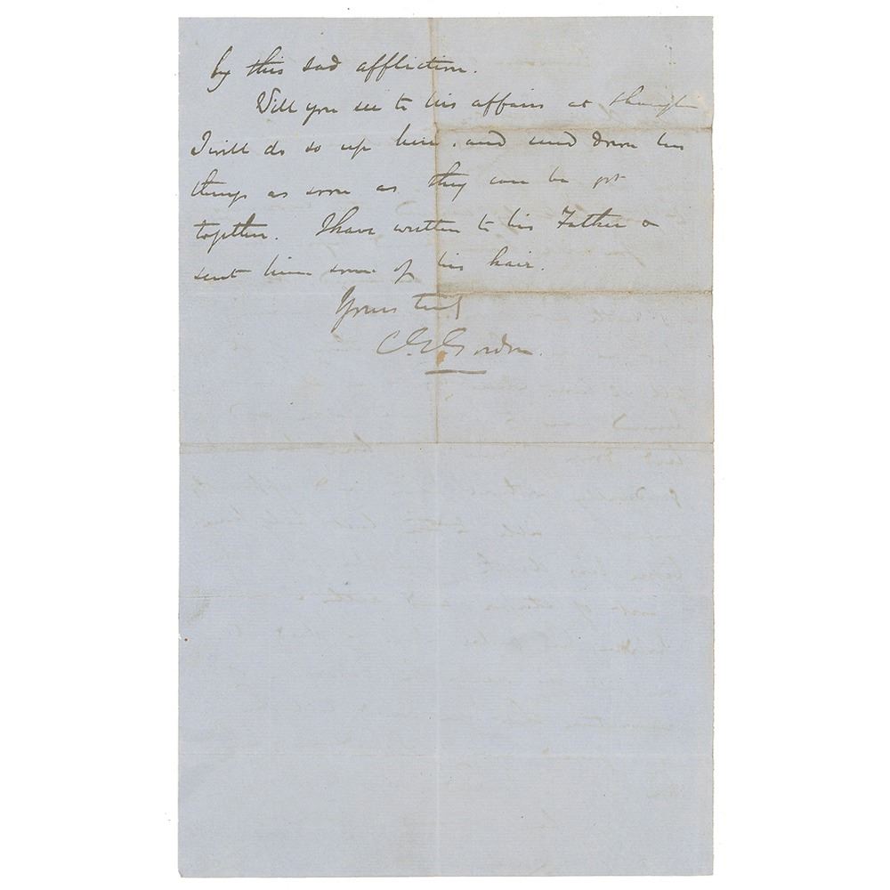 ALS signed "C. G. Gordon," one page both sides, 8 x 12.75, July 17, 1863. Written from Quinsan during his campaign against the Taipings, Gordon reports the death of a fellow officer and asks Ewing to conclude his affairs in Shanghai, in part, "He was a little out of sorts yesterday morning but no one thought anything of it till 12 noon when he came up in a hurried way to Moffit's room and laid down. From that hour he sank gradually without pain, and apparently perfectly sensible to the last half hour before his death, when he fell into a sort of stupor, and although I was holding his pulse when he died it was only by seeing the cessation of respiration that you could tell he had passed away. Will you see to his affairs in Shanghai." In fine condition, with intersecting folds.