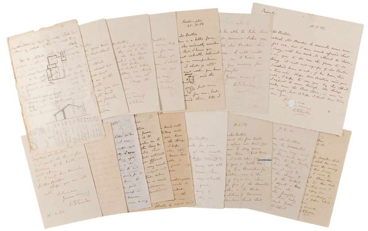 Intriguing archive of 17 ALSs to Charles Button in Seychelles, most signed “C. G. Gordon,” totaling 33 pages, dated 1881–1882; one is unsigned and lists repairs to his headquarters, and another is a partial ALS consisting of the last two pages. Gordon often writes of the coco de mer fruit and tortoises, both native to Praslin Island in the Seychelles, mentioning one or the other in a dozen letters. Praslin Island was the location of the Garden of Eden, according to Gordon, and he believed that the coco de mer was the fruit of the Tree of Knowledge. One letter, in part: “I want the four little Tortoises alive not dead…The Hindoos think that Curuman one of the incarnations of Bhudda, and which name signifies Tortoise when the flood came took the form of a Tortoise and placed the Ark on his back took it to Ararat with Noah. The Tortoise eggs take six months to hatch. The flood lasted four months so that I think the flood covered them and that when it subsided, the eggs were hatched, they never could have walked down from Ararat. You see none of these isles have much animal life on them.” Another, in part: “Tell me about the Coco de Mer and anything you can think of in the way of curious things…How is the Coco de Mer in the Govt Garden at Mahé and how are the Tortoises. I hope that they are looked after. Remember you are to keep the little ones for me of the Brood.” In overall very good to fine condition, with repaired separations to several letters.