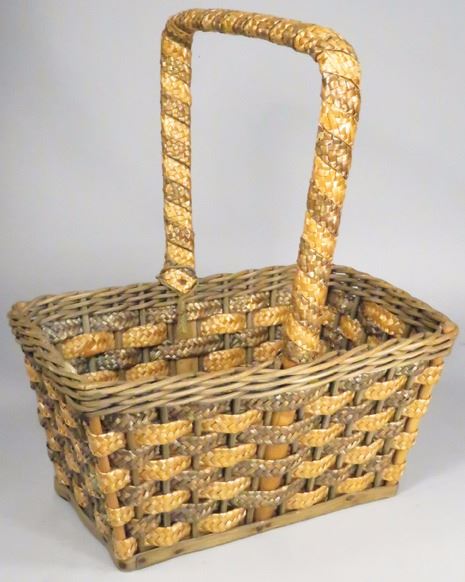 Charles & Co. Grocers Woven Shopping Basket. Advertising stamped into the bottom. Excellent condition. Stands 14 inches tall.
