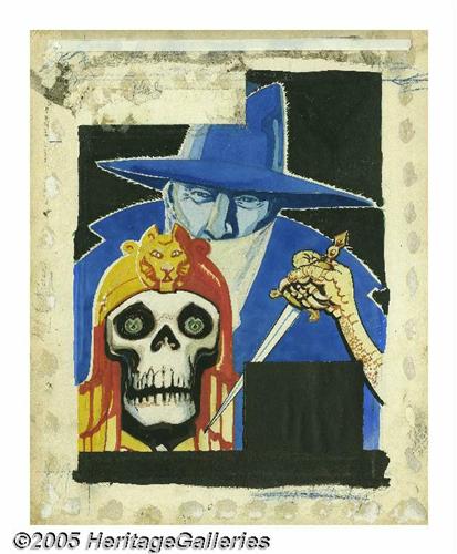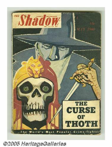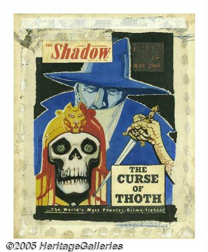<B>Charles Coll - The Shadow May, 1946 Pulp Cover Original Art (Street & Smith, 1946).</B></I> The world's most popular crime-fighter, the Shadow, defied "The Curse of Thoth" in this macabre cover montage. It was rumored that those who violated the tombs of the high priests of the Nile would suffer a horrible death from the hand Thoth, the Egyptian god of creation. When a strange bird-creature arises from the depths of an ancient and terrifying past to cast a spell of horror on its victims, who but the Shadow could grapple with the sinister monster? Charles Coll is celebrated for his work on the Golden Age <B>Shadow Comics</B></I> series, but he also painted several late forties <B>Shadow</B></I> pulp covers. This gouache on illustration board painting has an image area of 12" x 16.5", and is in Excellent condition. The work was originally painted without logos or type elements and these have been carefully recreated on an acetate overlay so that the work may be displayed with or without the type. A copy of the pulp magazine is also included in this lot. Here's your chance to capture a captivating cover scene spotlighting everyone's favorite pulp hero!