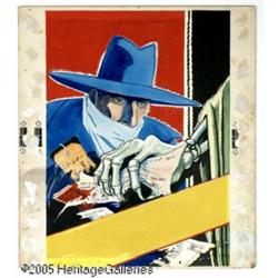 <B>Charles Coll - The Shadow Pulp Cover Original Art (Street & Smith, June, 1946).</B></I> A skeletal hand tears up a handful of clues right in front of the Shadow's penetrating gaze, on the cover for the June, 1946 story, "Alibi Trail" -- tsk, tsk, Mr. Bones is certainly flirting with disaster! In "Alibi Trail", a strange Spanish playing card, a baggage check, and a bank check are the only clues guiding The Shadow along a trail of crime and death. Can the Master of Darkness throw light on the forces of evil and bring them to justice? Charles Coll was a popular illustrator for the original Golden Age <B>Shadow</B></I> comic book title, and also painted several of the late 1940s <B>Shadow</B></I> Pulp covers. He was a cousin of the renowned magazine illustrator, Joseph Clement Coll. Coll's gouache on illustration board painting has an image area of 14" x 19.5", and is in Excellent condition. A facsimile of the printed cover is included in this lot. Winning any Pulp cover original would be thrilling, but acquiring a <B>Shadow</B></I> cover would rank as "the ultimate" for most Pulp aficionados -- The Shadow knows!