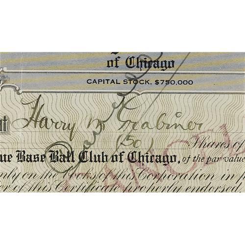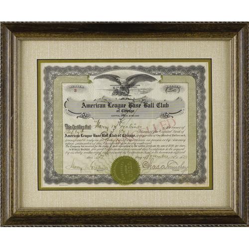 <B>1923 Chicago White Sox Stock Certificate Signed by Comiskey & Grabiner.</B></I> Both instrumental figures in the most noteworthy scandal in baseball history, team president Charles Comiskey and his "right hand man," secretary Harry Grabiner have signed off on this beautiful certificate issuing fifty shares to Grabiner himself. Of course Comiskey was the pecunious yet stingy team owner who forced the Eight Men Out to search for other ways to supplement their incomes in October of 1919. And Grabiner was not only the man who personally escorted Shoeless Joe back to Chicago after his trade from Cleveland in 1915, but also the figure to whom Jackson initially confessed his sin following the thrown World Series. Grabiner's signature appears twice here, once as Secretary and the other as the recipient of the stock. These autographs rate 7/10 and 8/10 respectively, while Comiskey's is a solid 9/10. The certificate itself is stamped "Cancelled" across the face and has vertical filing folds that bisect each of the lower signatures, but none of these factors have any noteworthy detrimental effect. Certificate measures 7.5x10" in size, and is matted and framed to final dimensions of 12.5x15". <I>LOA from PSA/DNA.</B></I> <BR><BR><B>Important notice:</B> Heritage usually auctions material at the rate of 200-250 lots per hour. On some occasions eBay Live bid software or the Internet may not be able to keep up with the pace of the auction. We recommend placing a realistic absentee bid now as insurance to avoid disappointment. Occasionally the auctioneer may eliminate or reject an eBay Live bid, and the auctioneer may also reopen a lot after the close of the eBay live bidding (usually because we missed an audience bid), and may reject your bid even if it shows you as the winning bidder. By bidding via eBay Live, you agree that Heritage may award the lot to another bidder at its sole discretion under the circumstances described above or any other reasonable circumstances. Since eBay bids are not shown to us until we open the lot on the floor, we treat those bids just like floor bids. In most cases the floor responds before the eBay bid is presented to us, due to Internet lag time, so for consistency we have made it a policy that floor bids are always considered first over tie eBay live bids. Also please note that all Heritage lots purchased through eBay Live carry a 22.5% Buyer's Premium. Please make sure you read the Terms and Conditions before you bid. This lot is being auctioned in conjunction with a live floor auction by Heritage Galleries & Auctioneers. All final auction and invoice information will be supplied by Heritage Galleries & Auctioneers, and all other information should be considered preliminary. Lot:19054 <BR><BR><B>Winning Notification and Billing:</B> After the FINAL session in this auction is complete, Heritage will send e-mail and snail mail invoices. This process normally takes several days. All final auction and invoice information will be supplied by Heritage Galleries & Auctioneers, and all other information should be considered preliminary. <BR><BR>This auction will be conducted on a live auction floor and over the Internet through eBay Live. If you choose to place an absentee bid, please take a moment to <font color='#0000ff'><u><a href='http://pages.ebay.com/liveauctions/help/before/laabsentee.html'>learn how eBay Live absentee bidding works</a></u></font><font color='#000000'>