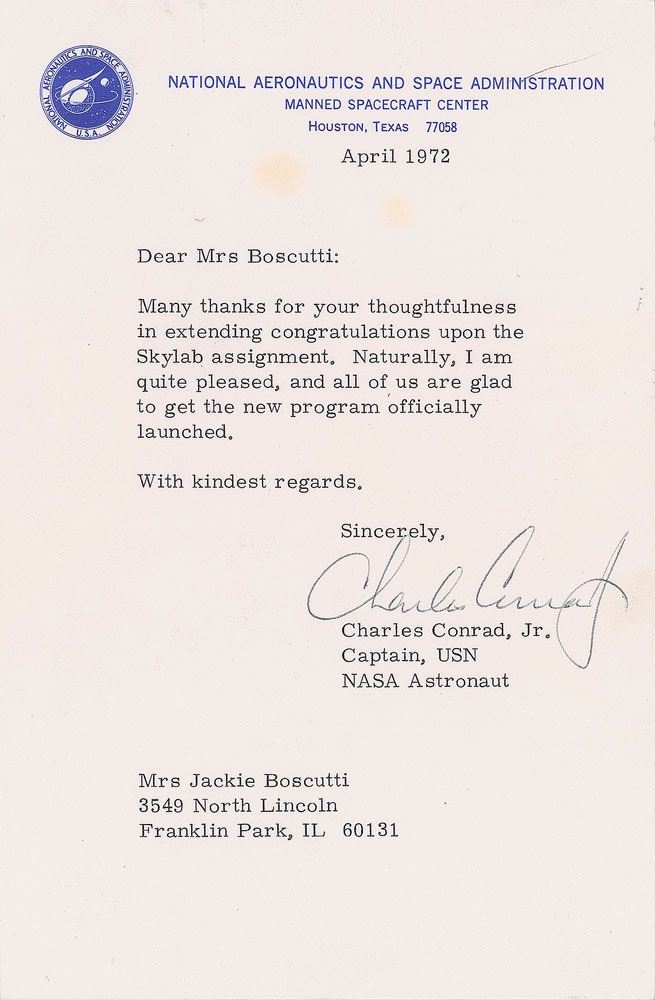 TLS signed “Charles Conrad, Jr.,” one page, 5.25 x 8, NASA letterhead, April 1972. Letter to Jackie Boscutti, in full: "Many thanks for your thoughtfulness in extending congratulations upon the Skylab assignment. Naturally, I am quite pleased, and all of us are glad to get the new program officially launched." In fine condition, with a couple spots of toning. Skylab was launched on May 14, 1973, the final unmanned launch from the famed Launch Complex 39 until February 19, 2017, the liftoff of SpaceX CRS-10.