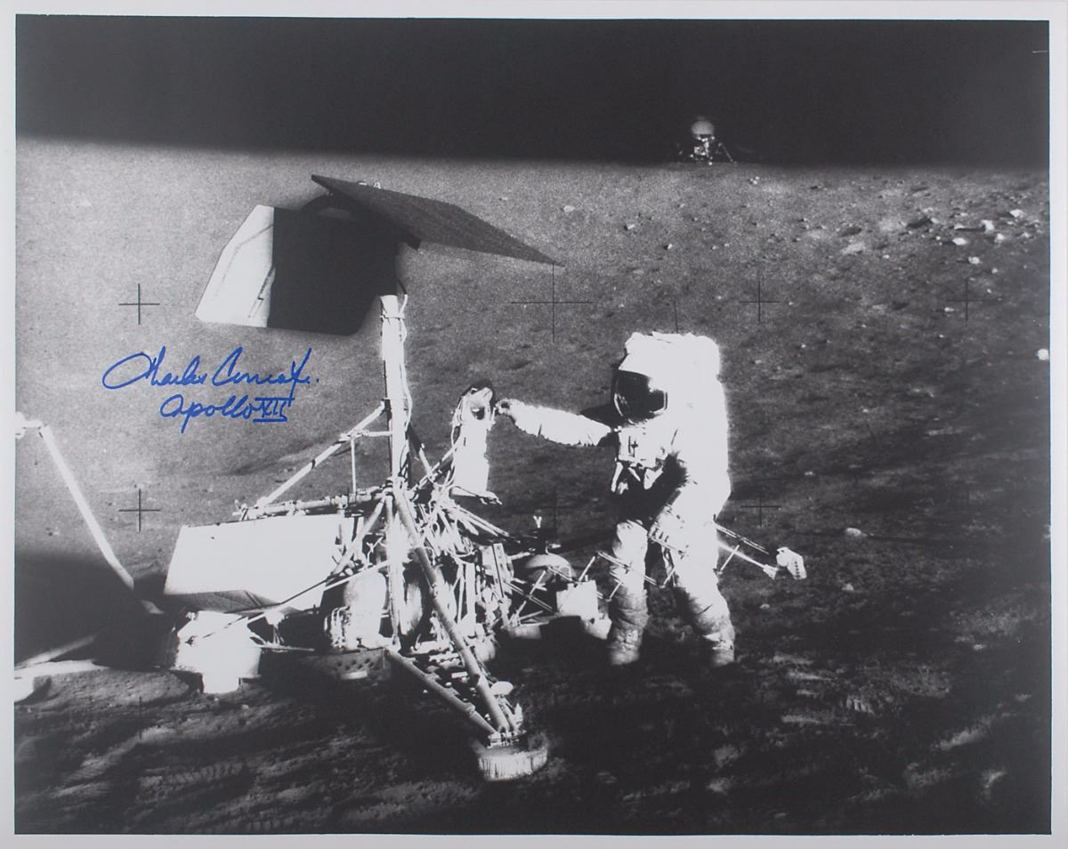 Otherworldly satin-finish 20 x 16 photo of Conrad conducting experiments on the lunar surface, signed in blue felt tip, “Charles Conrad, Jr., Apollo XII.” In fine condition, with trivial dings to edges and a small crease to lower right corner.
