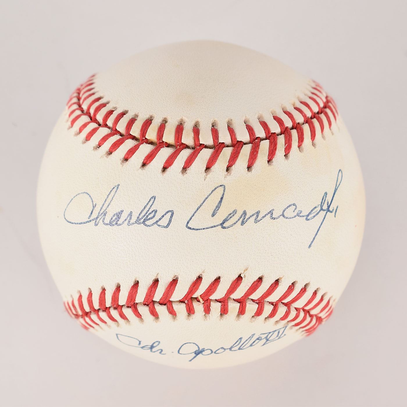 Desirable official Rawlings American League (Brown) baseball signed in blue ballpoint on the sweet spot, "Charles Conrad, Jr.," and marked with his position and mission on the lower panel, "Cdr. Apollo XII." In fine condition.