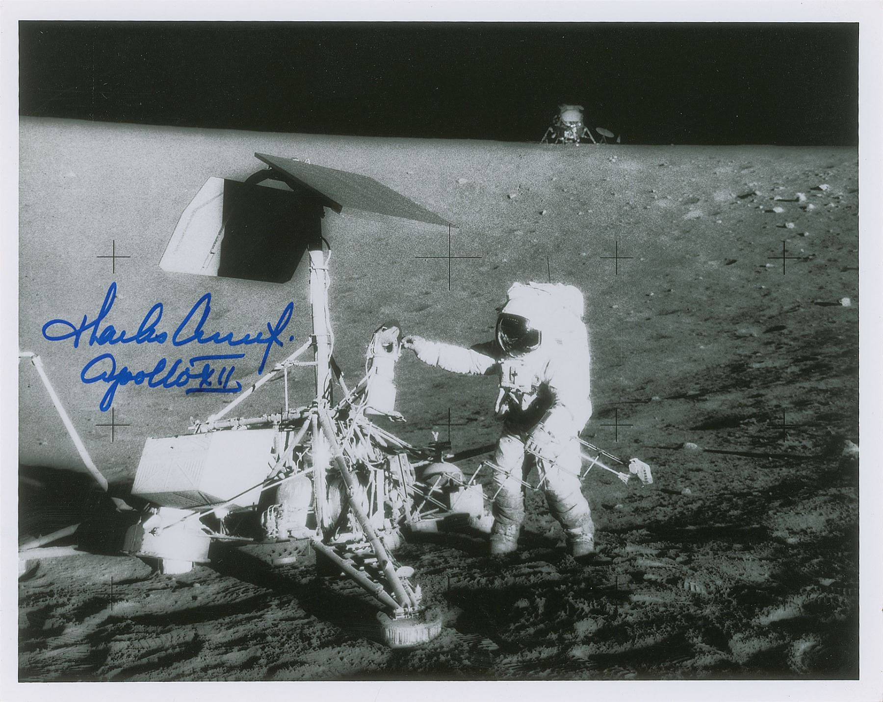 Satin-finish 10 x 8 photo of Charles Conrad examining the Surveyor III's TV camera during an Apollo 12 EVA, with the Lunar Module Intrepid visible in the background, signed in blue felt tip, "Charles Conrad, Jr., Apollo XII." In very fine condition.