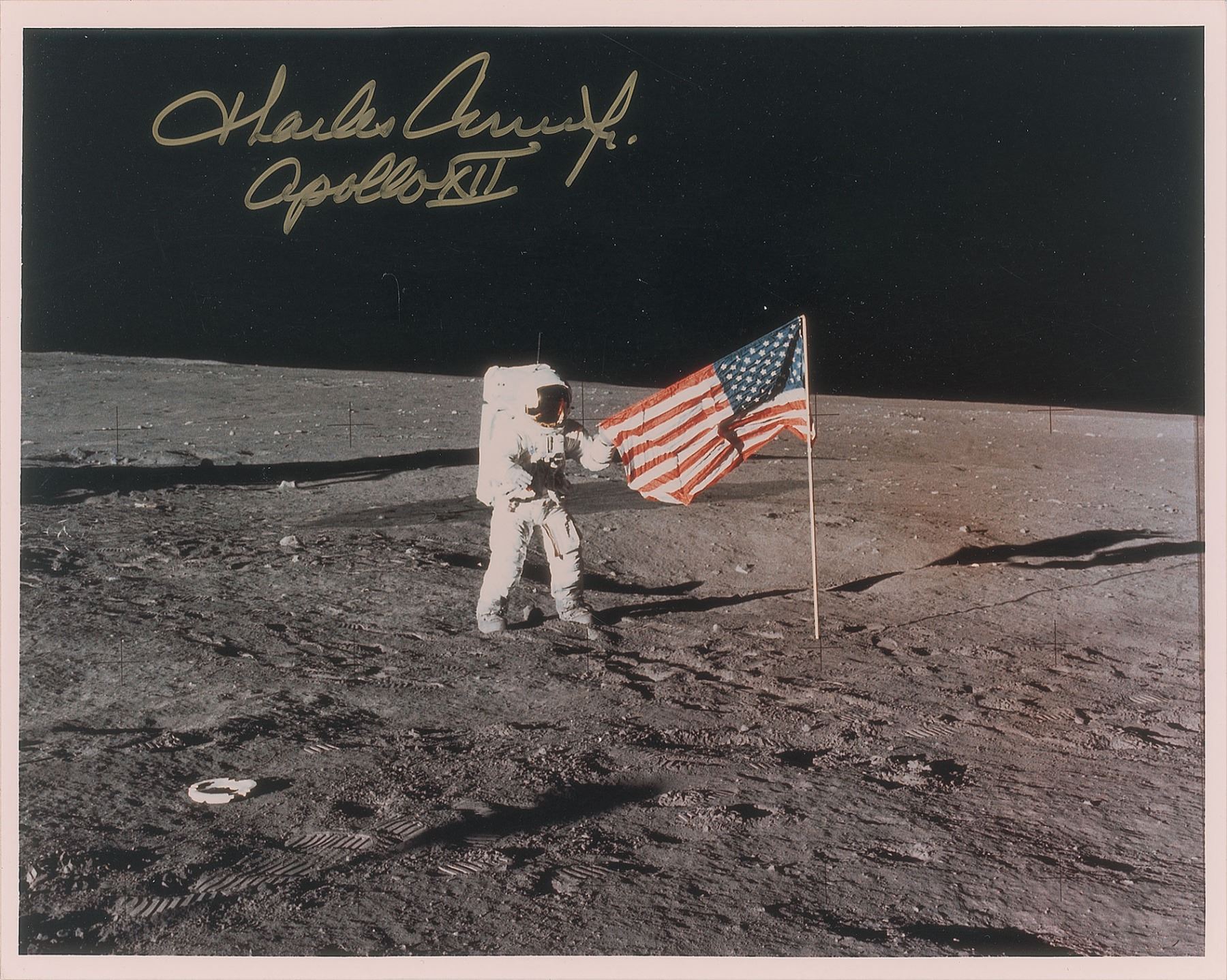 Color satin-finish 10 x 8 photo of Conrad holding the American flag on the lunar surface, neatly signed in gold ink, "Charles Conrad, Jr., Apollo XII." In very fine condition.