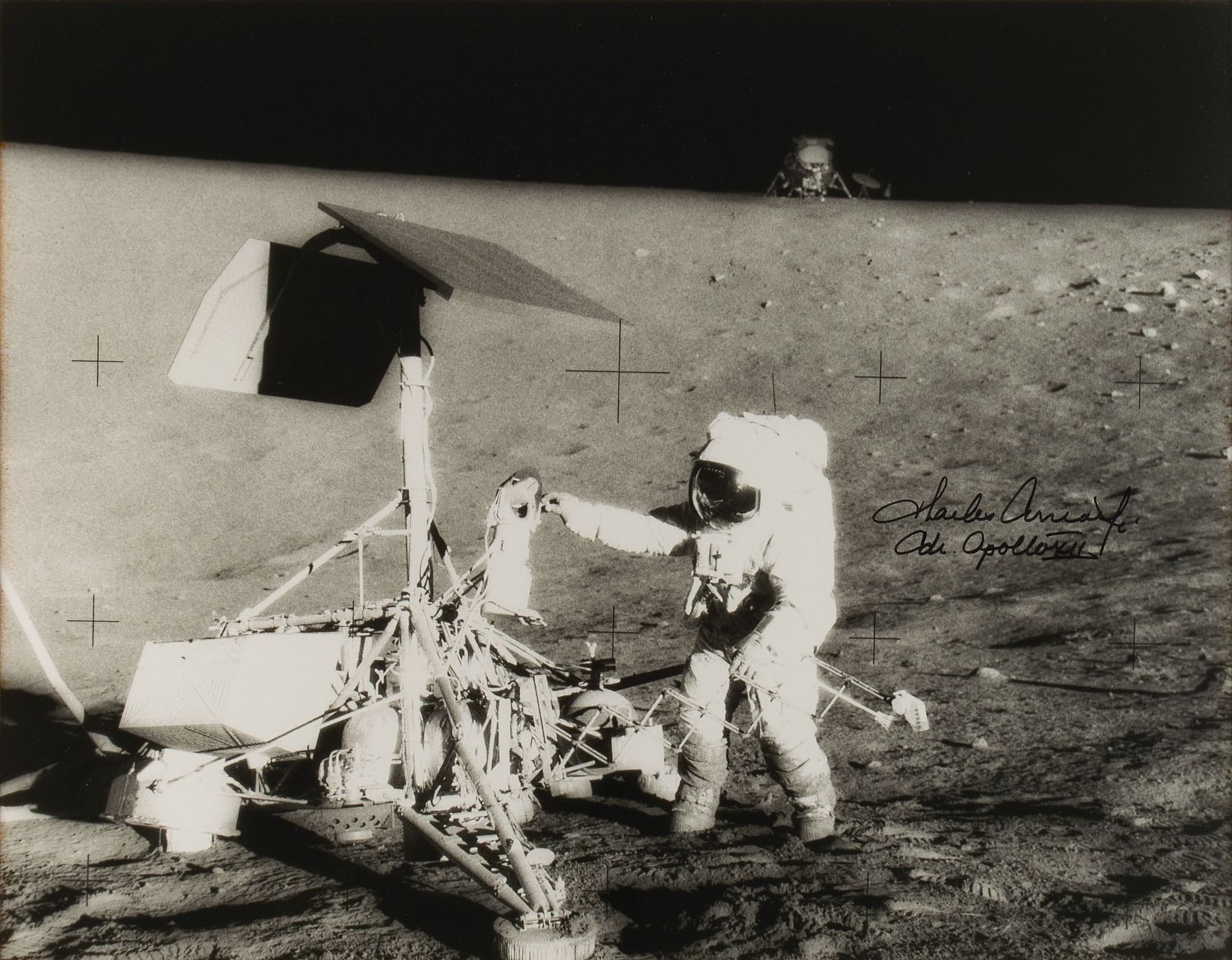 Satin-finish 19.25 x 15 photo of Conrad retrieving parts from the Surveyor 3 lander, signed in black felt tip, "Charles Conrad, Jr., Cdr. Apollo XII." Impressively double-matted and framed with a mission patch to an overall size of 27 x 26.5. In fine condition, with a bit of silvering to dark areas of the image. Accompanied by a certificate of authenticity from Premiere Space Editions.