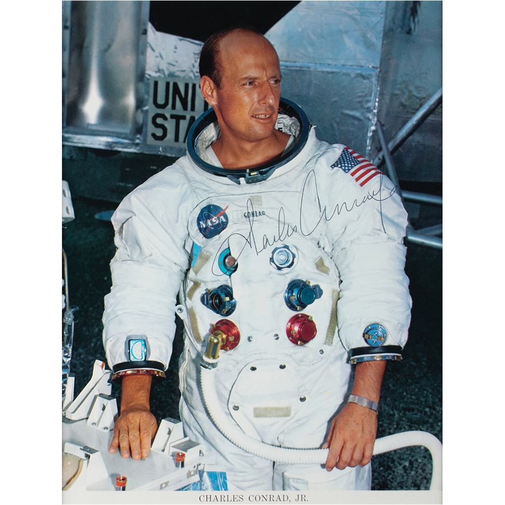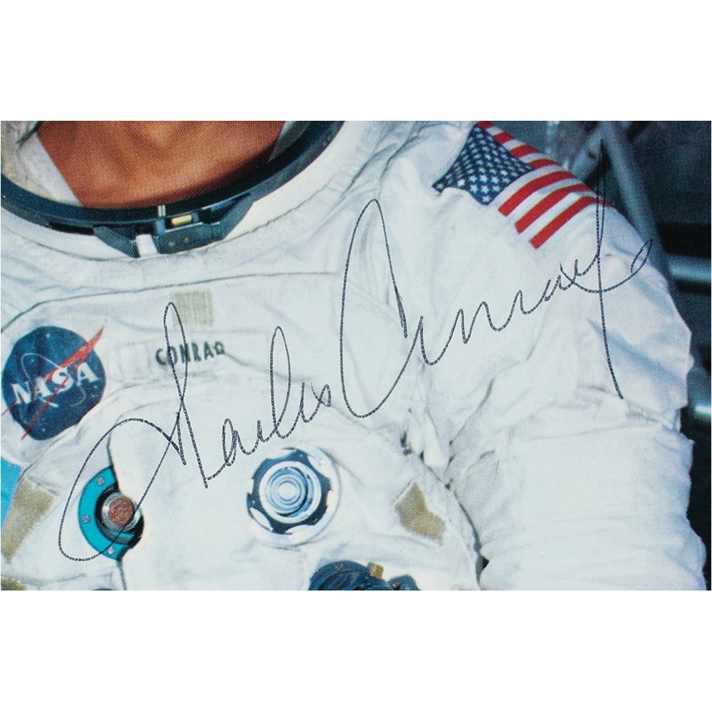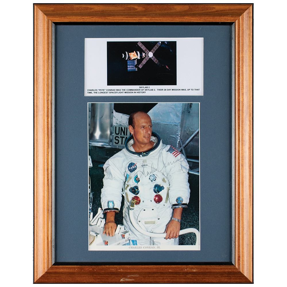 Official color NASA lithograph of Charles 'Pete' Conrad posing in his white Apollo space suit, signed in black ballpoint. Matted and framed with a Skylab 2 information sheet to an overall size of 14.75 x 18.75. In fine condition.