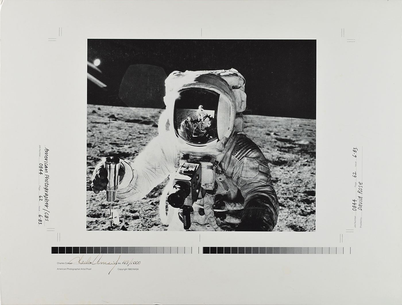 Limited edition 23 x 17.5 artist's proof print of Charles Conrad's lunar photo of Apollo 12 astronaut Alan Bean holding a special environmental sample container filled with lunar soil on November 20, 1969, numbered 169/1000, signed in black ink by Conrad, and countersigned by proofer David Rose, who identifies the work as "Job Number 0844," "Page 62," and "Issue 6-83." Affixed to a same-size piece of foamcore. In fine condition, with a couple of small edge dings.