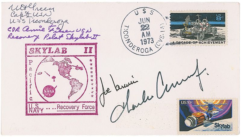 Skylab II prime recovery ship postal cover with a cachet honoring the naval recovery force of Skylab II, signed on the front in black felt tip by Joe Kerwin and Charles Conrad, as well as two members of the recovery force. In fine condition, with a bit of trivial toning along bottom.