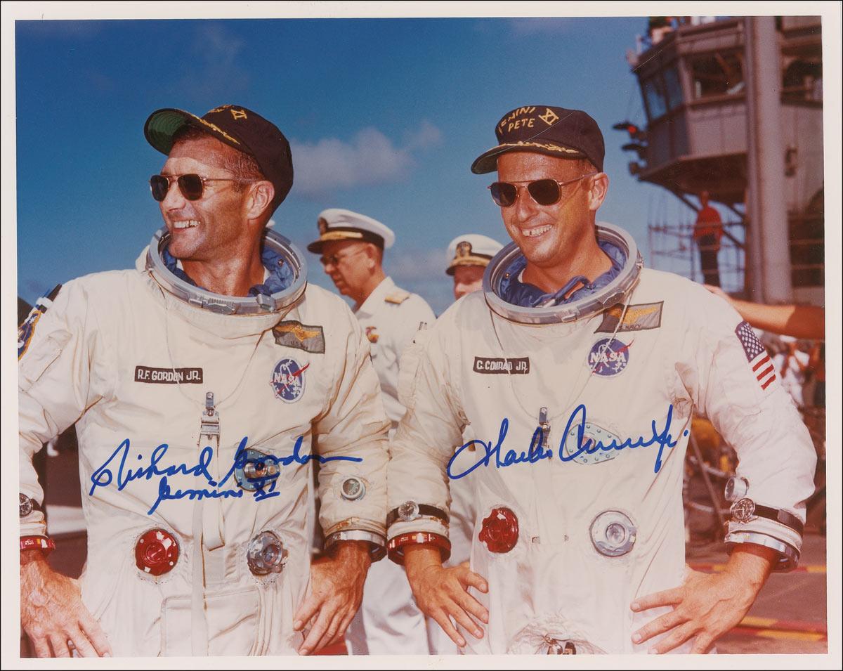 Color satin-finish 10 x 8 photo of the smiling Gemini 11 crew following their successful flight, signed in blue felt tip “Richard Gordon, Gemini XI” and “Charles Conrad, Jr.” In fine condition with a few light surface bends.