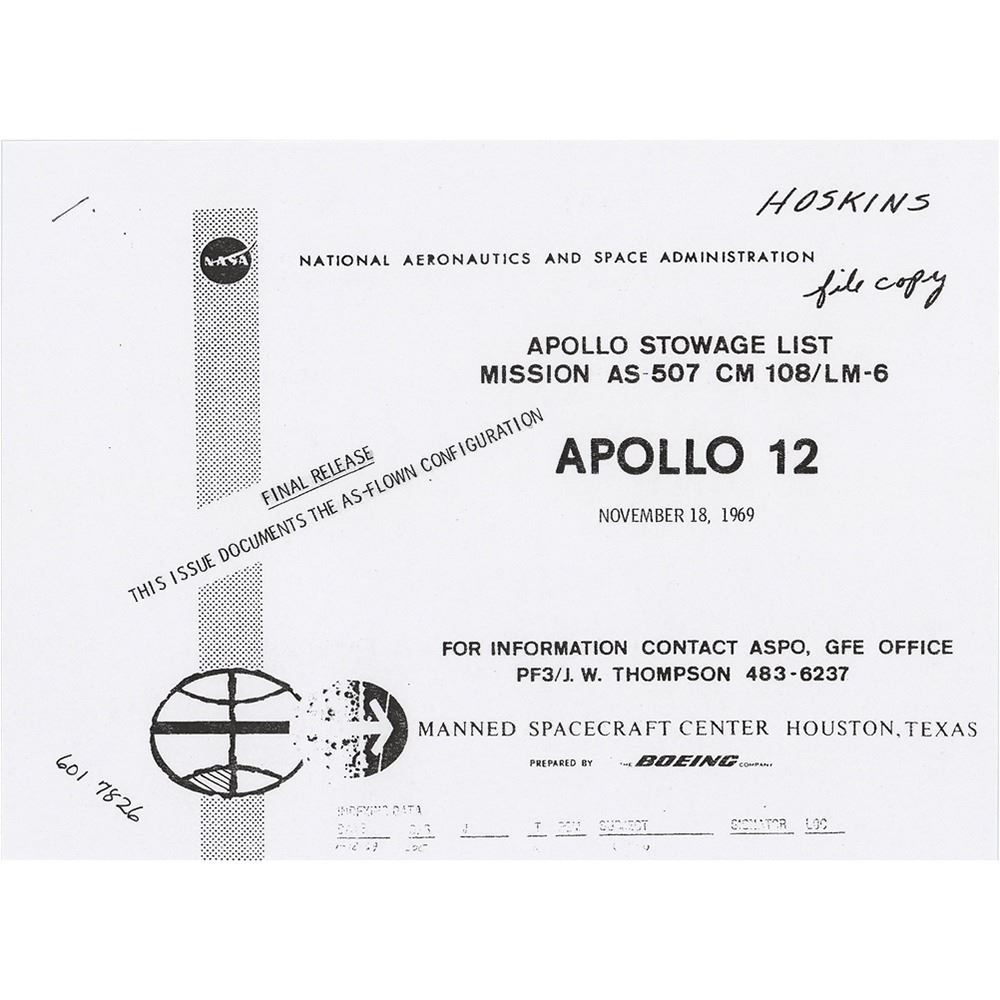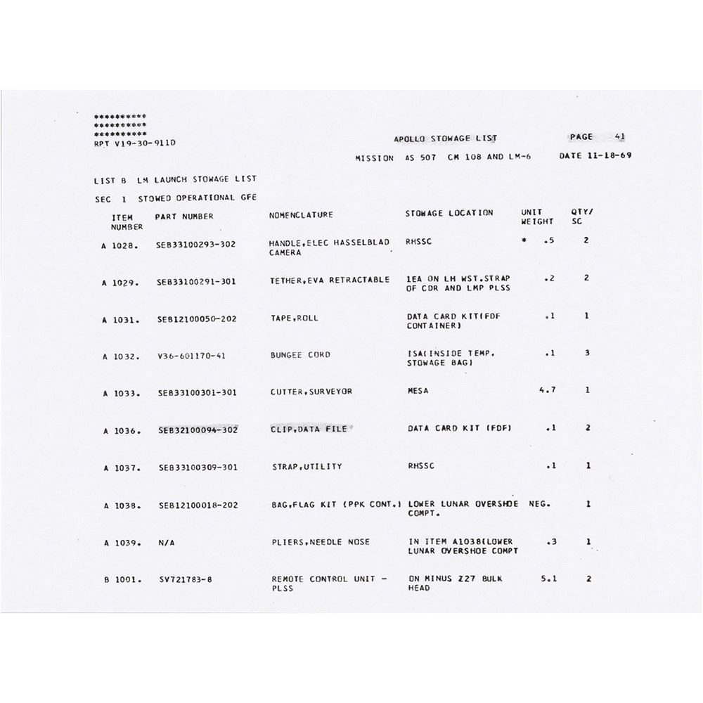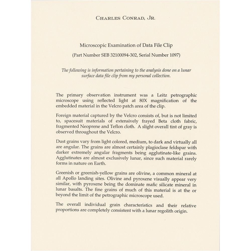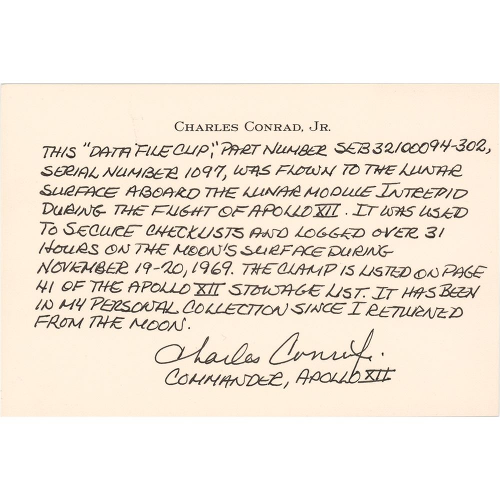 Flown Lunar Module data file clip carried to the lunar surface during the Apollo 12 mission, measuring 1.75" x 2.25" x 1", with etched part numbers: "P/N SEB3210094-302, S/N 1097 Assy." The aluminum checklist clip, used inside the Lunar Module 'Intrepid,' has a 1-inch square white Velcro patch on the front retaining embedded lunar soil material. Includes a handwritten letter of provenance signed by Apollo 12 Commander Charles Conrad, in full: "This 'Data File Clip,' part number SEB 32100094-302, S/N 1097, was flown to the lunar surface aboard the Lunar Module Intrepid during the flight of Apollo XII. It was used to secure checklists and logged over 31 hours on the moon's surface during November 19-20, 1969. The clamp is listed on page 41 of the Apollo XII stowage list. It has been in my personal collection since I returned from the moon." Also includes a one-page typed document on Conrad's personal letterhead, documenting a microscopic examination of the clip, outlining the material seen in the Velcro, including frayed spacesuit materials and dust grains "completely consistent with a lunar regolith origin." In fine condition.
