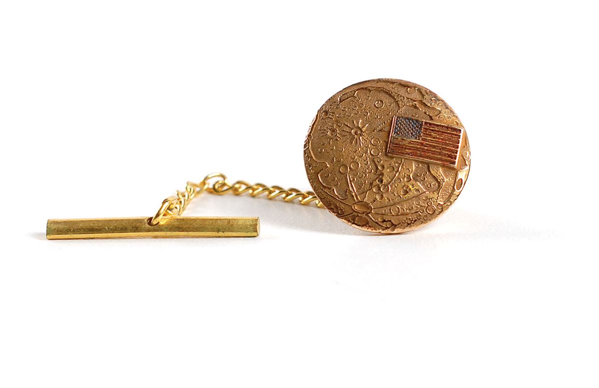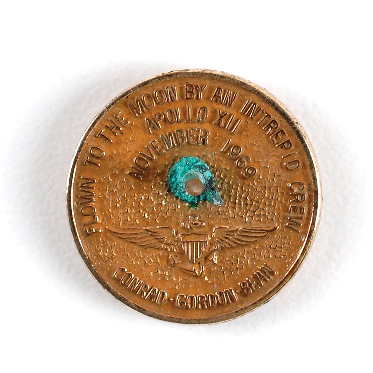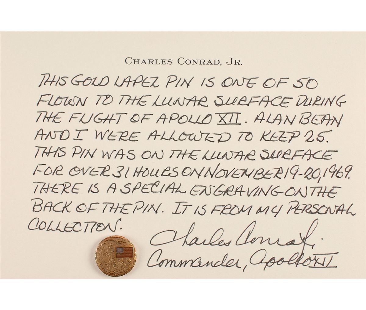Flown gold-tone tie tack pin carried on the Apollo 12 mission, approximately .75? in diameter, depicting an American flag against a lunar background, pinned to an off-white 6.25 x 4.25 handwritten and signed provenance note by Charles Conrad, in full: “This gold lapel pin is one of 50 flown to the lunar surface during the flight of Apollo XII. Alan Bean and I were allowed to keep 25. This pin was on the lunar surface for over 31 hours on November 19–20, 1969. There is a special engraving on the back of the pin. It is from my personal collection. Charles Conrad, Jr., Commander, Apollo XII.” The raised text on the reverse of the pin reads: “Flown to the moon by an intrepid crew, Apollo XII, November 1969, Conrad-Gordon-Bean.” In fine condition. A spectacular piece flown on man’s second journey to the lunar surface enhanced by its superior handwritten provenance.