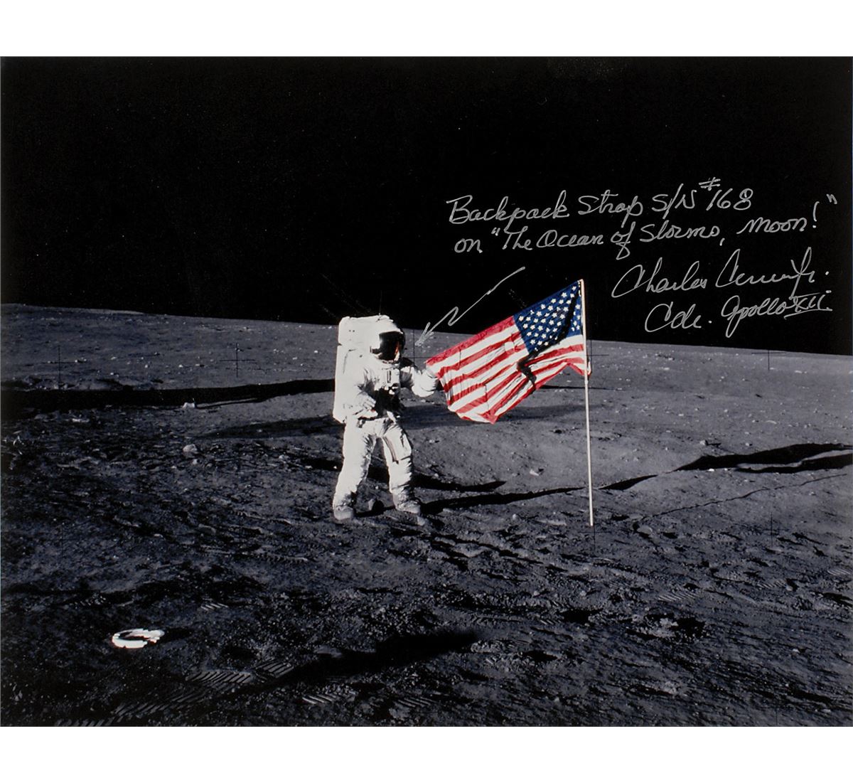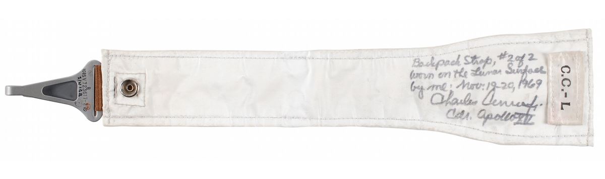 Amazing and incredibly rare backpack strap from Conrad’s Personal Life Support System (PLSS), used on the lunar surface during both of his moonwalks on the Apollo 12 mission, signed and certified on the front in black felt tip, “Backpack strap, #2 of 2, worn on the lunar surface by me; Nov. 19–20, 1969. Charles Conrad, Jr., Cdr. Apollo XII.” Strap measures 16? in overall length, with a metal clip to lower end numbered "B ISIS V723617-2, S/N 168." A similar clasp is contained within a pocket at the opposing end of the strap. A label sewn to this end of the strap reads “C.C.—L [Charles Conrad—Left].” In fine condition, with expected light wear and soiling from use. Also includes a satin-finish 14 x 11 photo of Conrad next to the American flag during his EVA, signed in silver ink, "Backpack strap S/N #168 on 'The Ocean of Storms, Moon!' Charles Conrad, Jr., Cdr. Apollo XII," drawing an arrow to the location of the strap on his spacesuit.