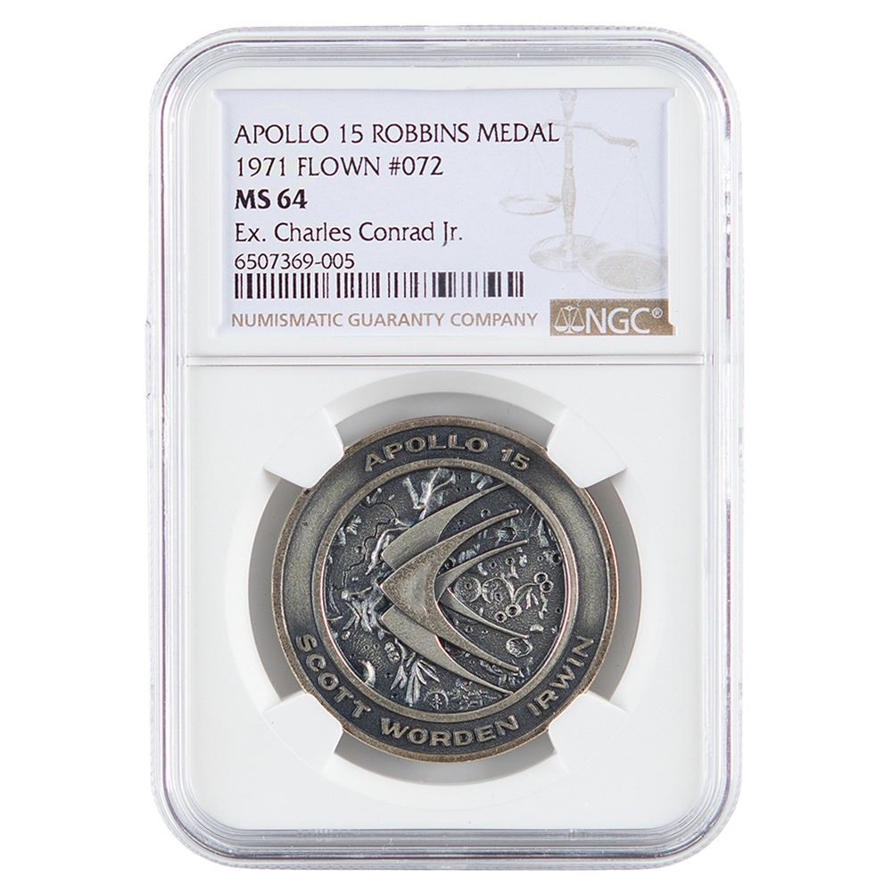 Charles Conrad’s flown sterling silver Apollo 15 Robbins medallion, approximately 1.5Ë diameter, with a raised design of the Apollo 15 mission insignia on the face—three stylized birds soaring over the moon's Hadley–Apennine region, encircled by the names of the mission and crew. The reverse features a quote in raised text, "Man's Flight Through Life Is Sustained by the Power of His Knowledge," and is engraved with the launch date of July 26, 1971; moon landing date of July 30, 1971; and return date of August 7, 1971. The medal is serial numbered "072" on the edge, and stamped with the Robbins "Sterling" hallmark. Encapsulated and graded by NGC as "MS 64," with the label noting the provenance, "Ex. Charles Conrad Jr."