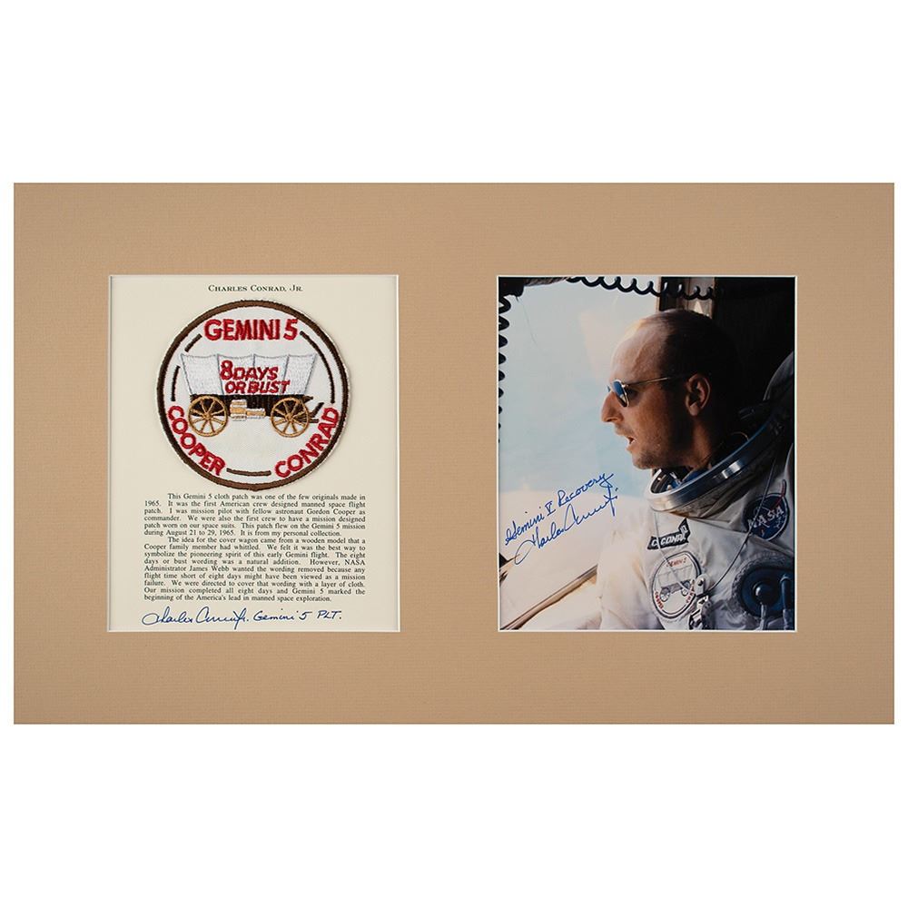 Large flown embroidered Gemini 5 mission patch, 4˝ in diameter, affixed to a letter of provenance signed in blue felt tip by Pilot Charles Conrad, in part: "This Gemini 5 cloth patch was one of the few originals made in 1965. It was the first American crew designed manned space flight patch…This patch flew on the Gemini 5 mission during August 21 to 29, 1965. It is from my personal collection. The idea for the cover wagon came from a wooden model that a Cooper family member had whittled. We felt it was the best way to symbolize the pioneering spirit of this early Gemini flight. The eight days or bust wording was a natural addition. However, NASA Administrator James Webb wanted the wording removed because any flight time short of eight days might have been viewed as a mission failure. We were directed to cover that wording with a layer of cloth. Our mission completed all eight days and Gemini 5 marked the beginning of the United States lead in manned space exploration." The patch and letter are matted alongside a color satin-finish 6.25 x 7.25 photo of Conrad after recovery with an example of the patch on his suit, signed in blue felt tip, "Gemini V Recovery, Charles Conrad, Jr." The display measures an overall 18.5 x 11.5. In fine condition. A historic flown piece representing America's pioneering position in the history of manned spaceflight.