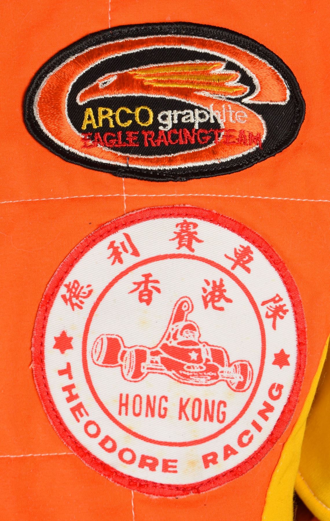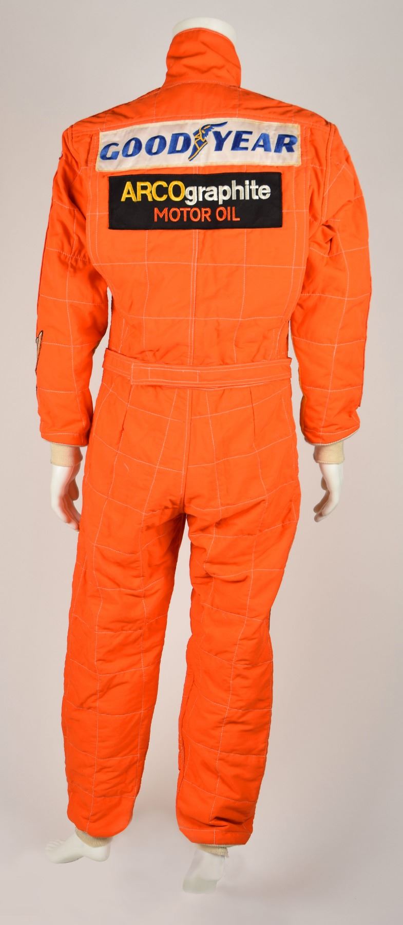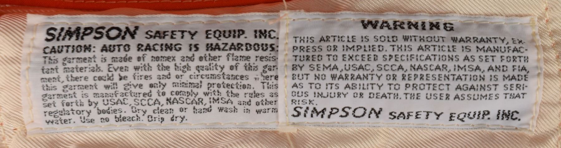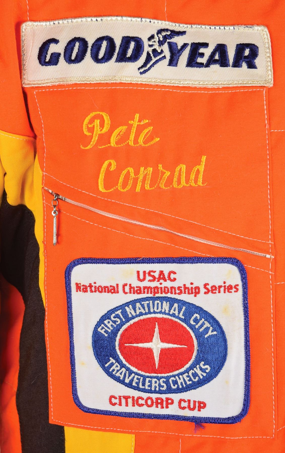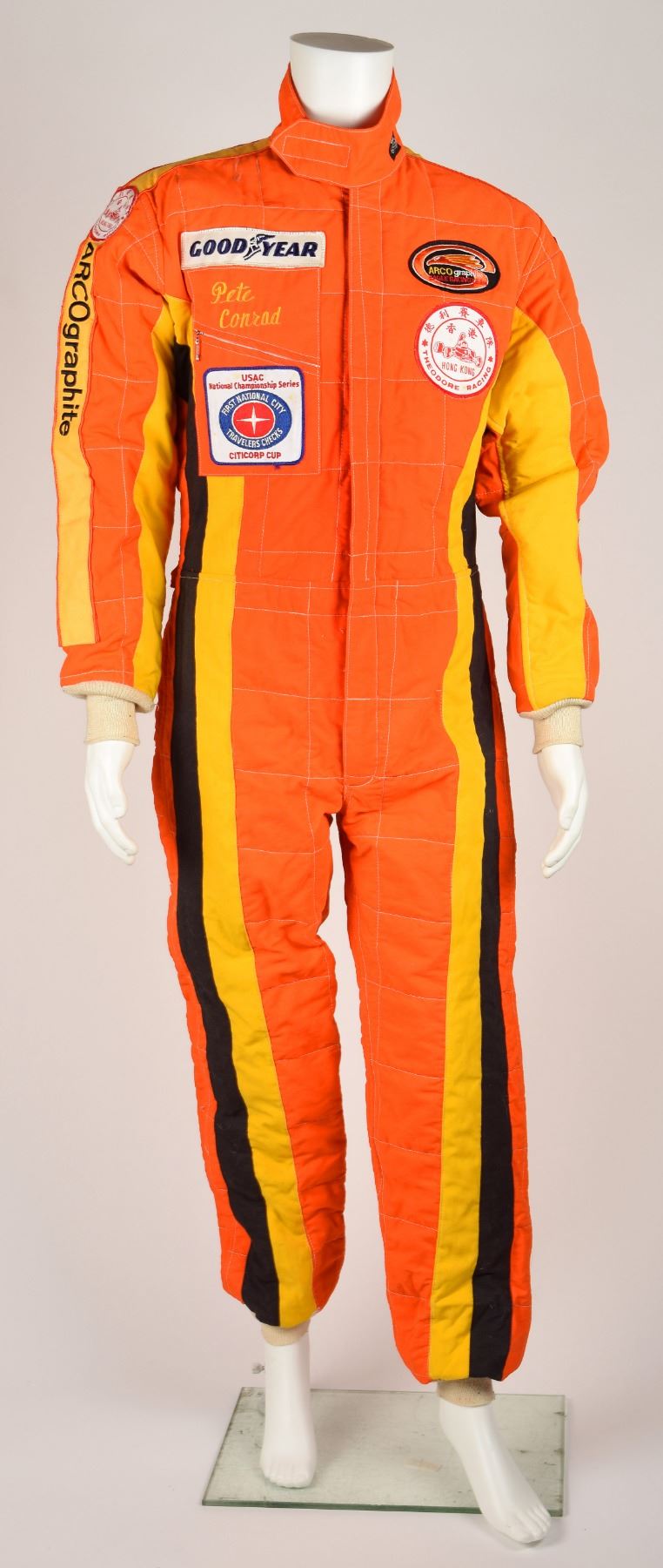 Bright orange Nomex racing suit personally-owned and -worn by Apollo 12 moonwalker Charles ‘Pete’ Conrad. The flame-resistant racing suit features yellow and black stripes, wrist and ankle knit cuffs, a zip-up front and adjustable waist strap, and a Velcro collar with sewn-on black Simpson patch. Conrad’s name, “Pete Conrad,” is stitched with yellow thread above a zippered pocket on the right chest. The inner collar area bears Simpson Safety Equip., Inc., manufacturing and warning labels, affirming that the “garment is manufactured to comply with the rules as set forth by USAC, SCCA, NASCAR, IMSA and other regulatory bodies.” The suit features several sewn-on embroidered patches for Conrad’s sponsors and racing teams, such as: Goodyear, Simpson Safety Equipment, Hong Kong Theodore Racing, USAC National Championship Series Citicorp Cup, and ARCO Graphite Eagle Racing Team, with the company name emblazoned in black thread along both arms. In fine condition. Following his retirement from NASA in December 1973, Conrad worked for the American Television and Communications Company and then later with McDonnell Douglas. He divvied up his free time by pursuing his other interests, which included golf, water skiing, and auto racing, such as Formula Vee. Accompanied by a certificate of authenticity from Farthest Reaches, in part: "The nomex racing suit that accompanies this COA comes from the personal wardrobe of Astronaut Charles 'Pete' Conrad. The suit was produced by Simpsons Safety Equipment Inc. for the exclusive use of Pete Conrad."