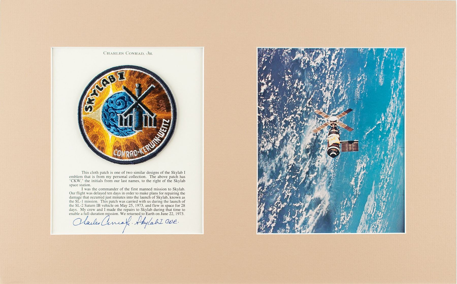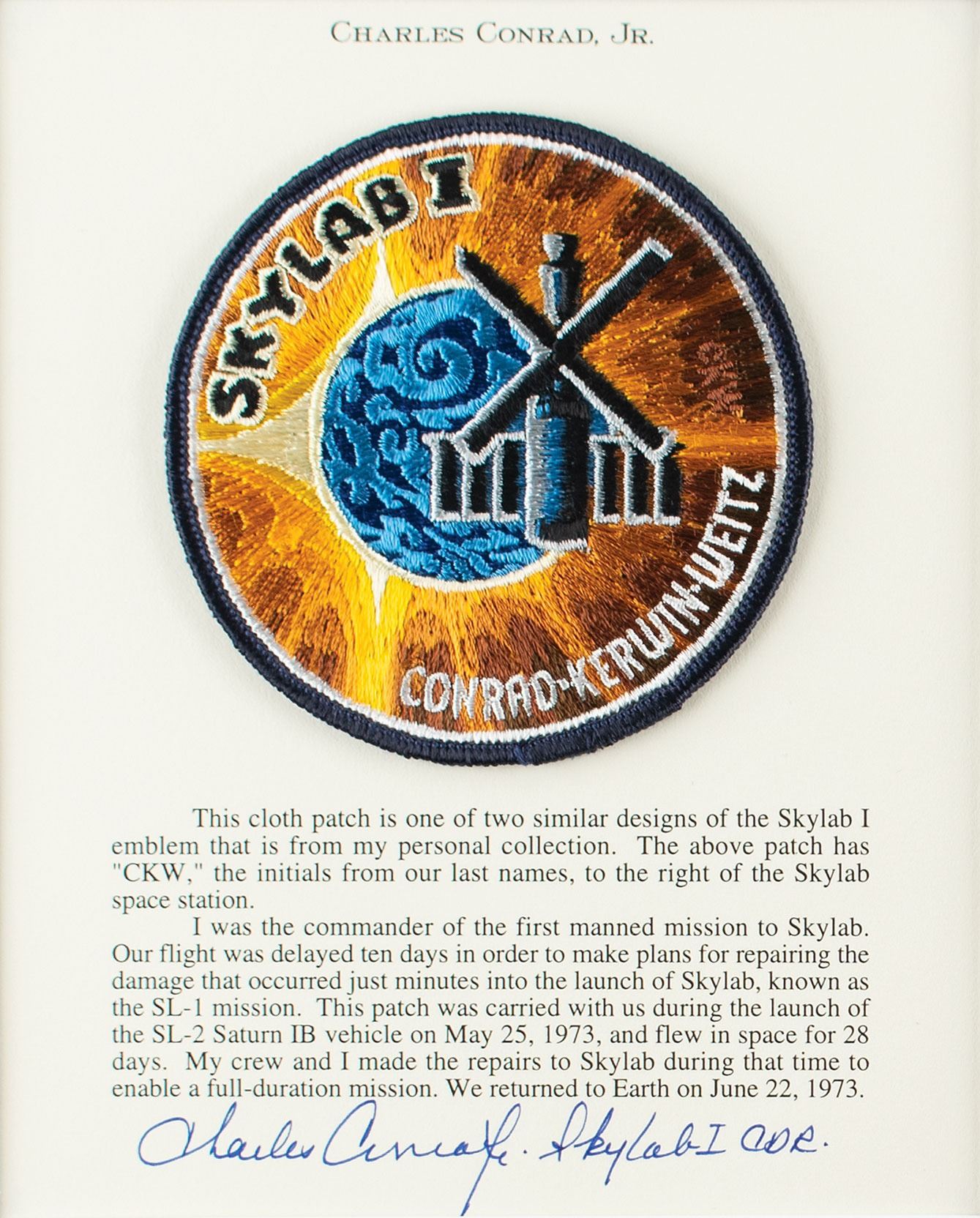 Beautiful flown embroidered Skylab I mission patch, 4˝ in diameter, affixed to a letter of provenance signed in blue felt tip by Commander Charles Conrad, in part: "This cloth patch is one of two similar designs of the Skylab I emblem that is from my personal collection. The above patch has 'CKW,' the initials from our last names, to the right of the Skylab space station. I was the commander of the first manned mission to Skylab…This patch was carried with us during the launch of the SL-2 Saturn IB vehicle on May 25, 1973, and flew in space for 28 days." Matted alongside a color lithograph of the Skylab space station to an overall size of 18.5 x 11.5. In fine condition.