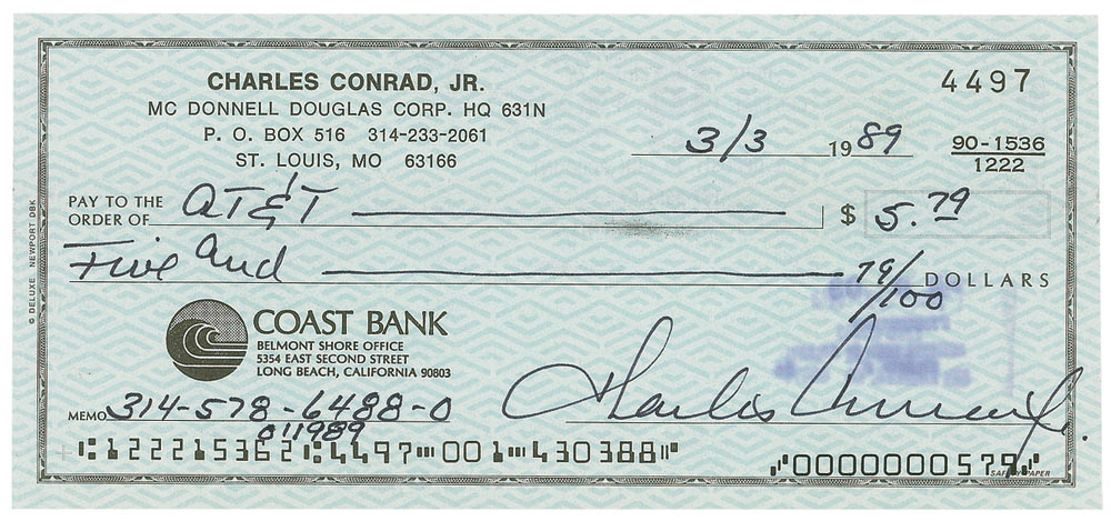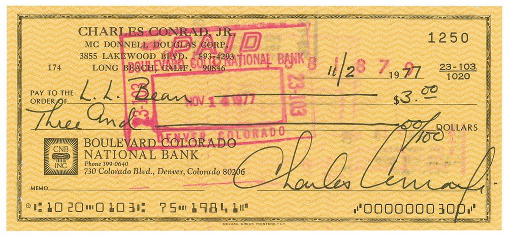 Two personal checks, both 6 x 2.75, both filled out and signed by Conrad, “Charles Conrad, Jr.,” one from 1977 payable to L.L. Bean, the other from 1989 payable to AT&T. In fine condition, with stamp to body of earlier check, and mild show-through from stamps on reverse of both checks.