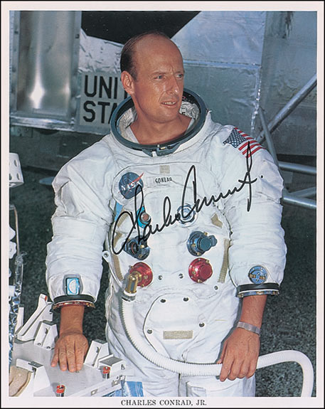 Color 8 x 10 NASA photo of Conrad posing in his space suit, signed in black felt tip “Charles Conrad, Jr.” In fine condition.