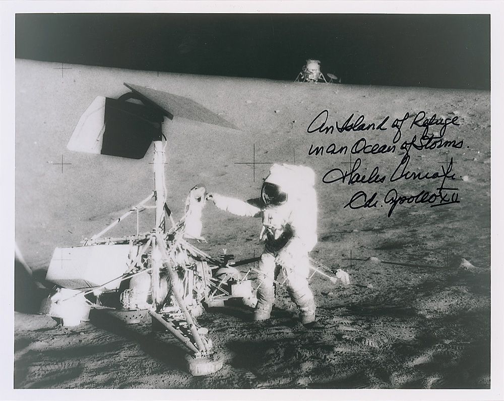 Glossy 10 x 8 photo of Conrad performing an experiment on the lunar surface, signed in black felt tip, “An Island of Refuge in an Ocean of Storms. Charles Conrad, Apollo XII.” In very fine condition.