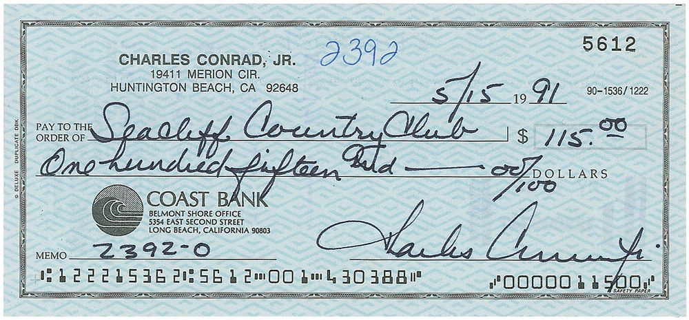 Personal check, 6 x 2.75, filled out and signed by Conrad, “Charles Conrad, Jr.,” payable to Seacliff Country Club for $115.00, May 15, 1991. In fine condition, with small ink notation to top.