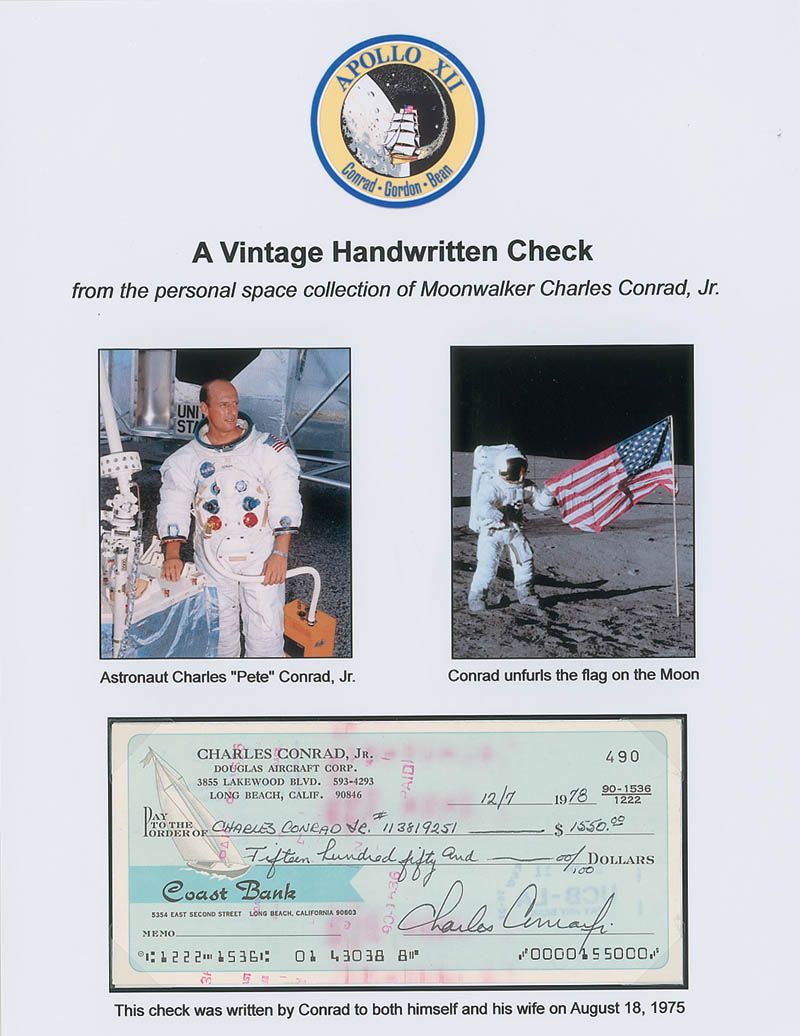 Personal check, 6 x 2.75, filled out in another hand and signed by Conrad, payable to Charles Conrad, Jr. for $1550.00, December 7, 1978. Removably presented on a color 8.5 x 11 informational sheet. In fine condition, with light show-through from bank stamps on reverse.