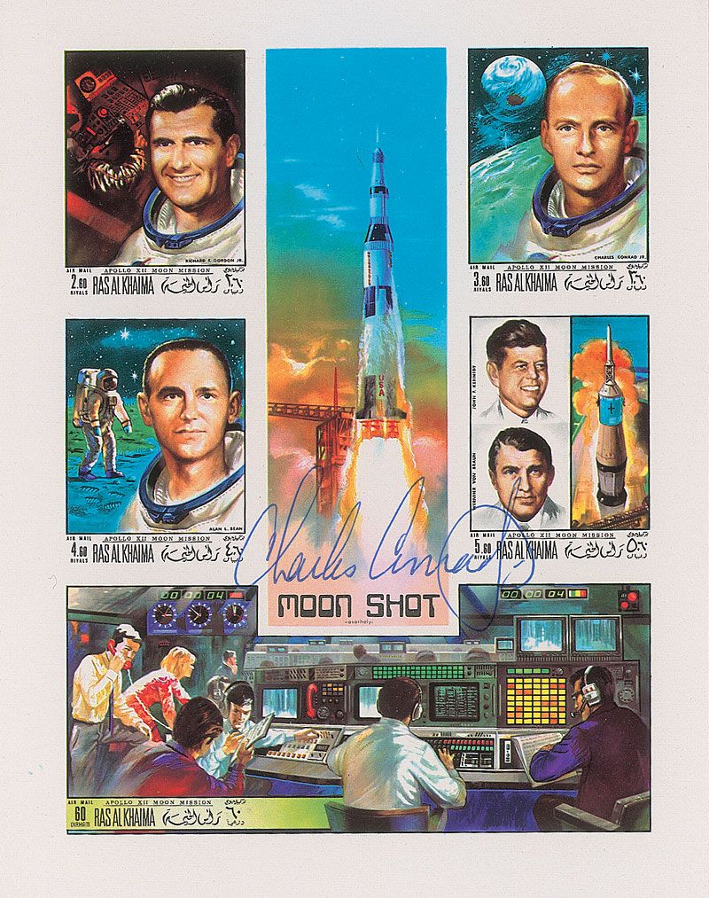 Philatelic souvenir of images of four Ras al-Khaimah postage stamps, 5.25 x 7, signed across the center in blue ballpoint. In fine condition.