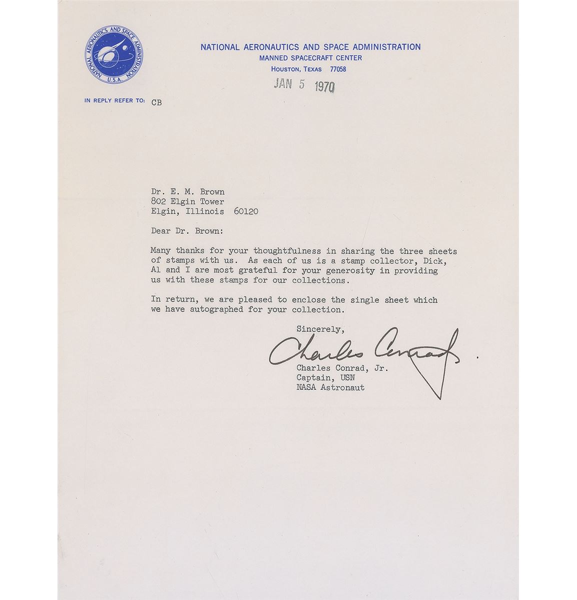 TLS, one page, 8 x 10.5, NASA letterhead, January 5, 1970. Letter to E. M. Brown, in full: “Many thanks for your thoughtfulness in sharing the three sheets of stamps with us. As each of us is a stamp collector, Dick, Al and I are most grateful for your generosity in providing us with these stamps for our collections. In return, we are pleased to enclose the single sheet which we have autographed for your collection.” In fine condition, with trivial creasing.