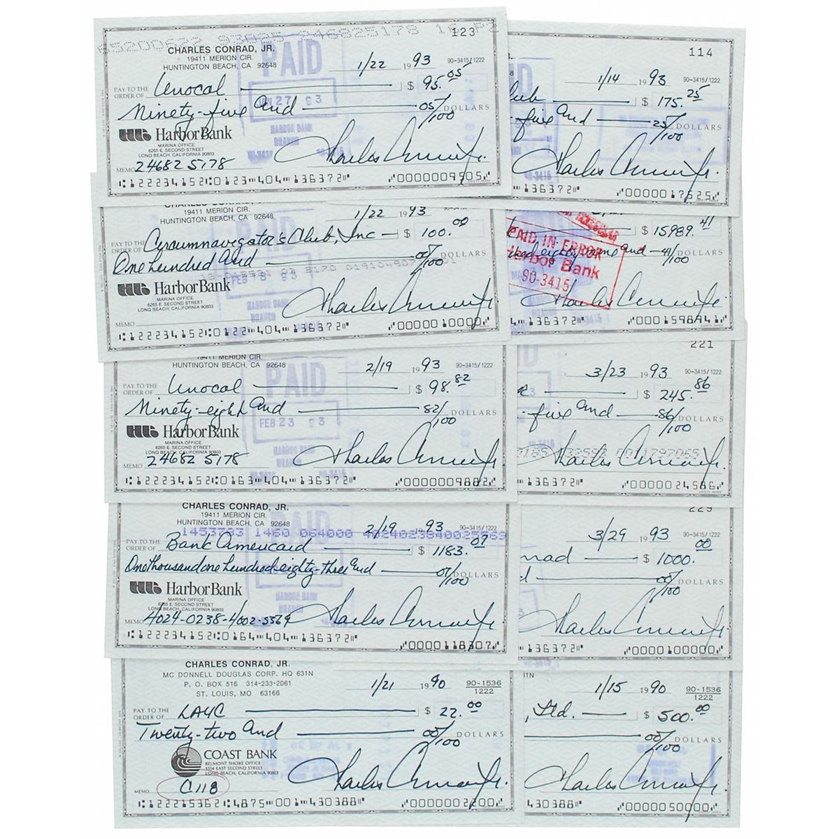 Collection of ten personal checks, 6 x 2.75, each filled out and signed by Conrad, “Charles Conrad, Jr.,” dated between 1990 and 1993. In overall fine condition, with expected bank notations and stamps (affecting portions of the signatures).