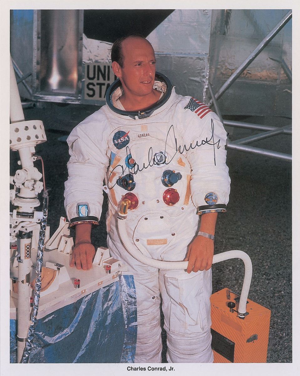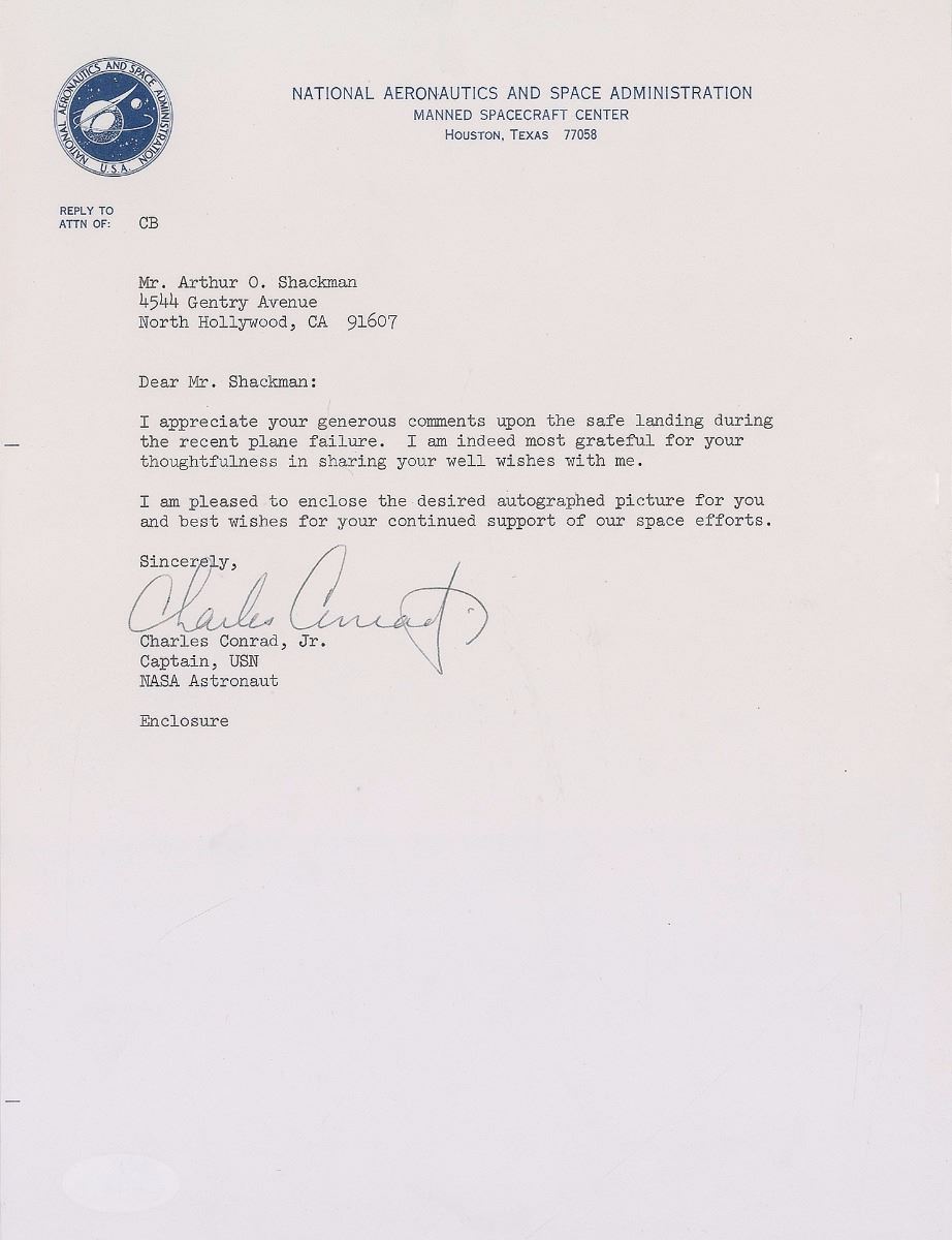 Two items: a TLS, one page, 8 x 10.5, NASA letterhead, no date, in full: “I appreciate your generous comments upon the safe landing during the recent plane failure. I am indeed most grateful for your thoughtfulness in sharing your well wishes with me. I am pleased to enclose the desired autographed picture for you and best wishes for your continued support of our space efforts”; and an official color 8 x 10 NASA lithograph of Conrad posing in his white space suit, signed in black felt tip. In overall fine condition, with show-through from a JSA label to reverse of the letter, and a JSA label affixed to the reverse of the lithograph. Both are accompanied by certificates of authenticity from JSA.