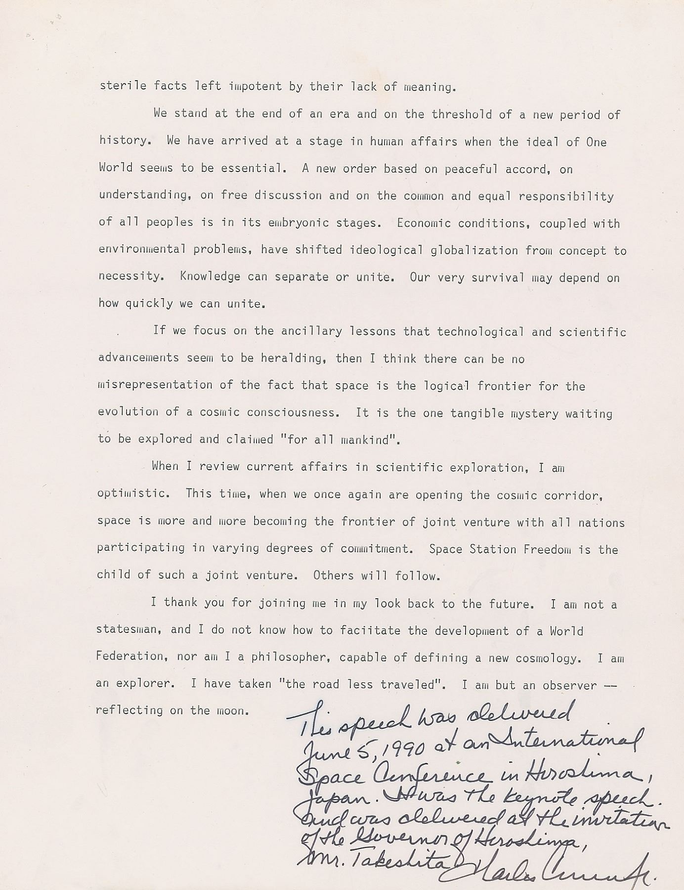 Souvenir typescript for a speech delivered by Apollo 12 moonwalker Charles Conrad, 16 pages, 8.5 x 11, signed at the conclusion in black felt tip: "This speech was delivered June 5, 1990 at an International Space Conference in Hiroshima, Japan. It was the keynote speech, and was delivered at the invitation of the Governor of Hiroshima, Mr. Takeshita, Charles Conrad, Jr." Highlights of the speech include: "The timing for the globalization of consciousness could not be better. However, the greatest impediment to our continued evolution is the fact that our planet is deteriorating. We need to recognize that eventually we will have to go somewhere else. The world is becoming a large strip mine. A large measure has been caused by man…We, Gordon Cooper and myself, set the record for man hours in space of 190 hours. We had had some problems trying to launch and scrubbed at T minus 10 minutes. When we finally lifted off, I can remember very clearly that it was a beautiful day. There was a bee outside the window, and, as we launched, he launched…I had a great time on the moon. It was a fantastic experience. If you've ever watched the tapes of our landing, you'll note I was laughing and frolicking for most of the time I spent on the lunar surface. There was a sense of elation and exhilaration. The moon was stark but beautiful, and I was amazed at how truly small it was." In fine condition, with staple holes to the upper left corner of each page, and some light creasing to the lower right corner of the first page.