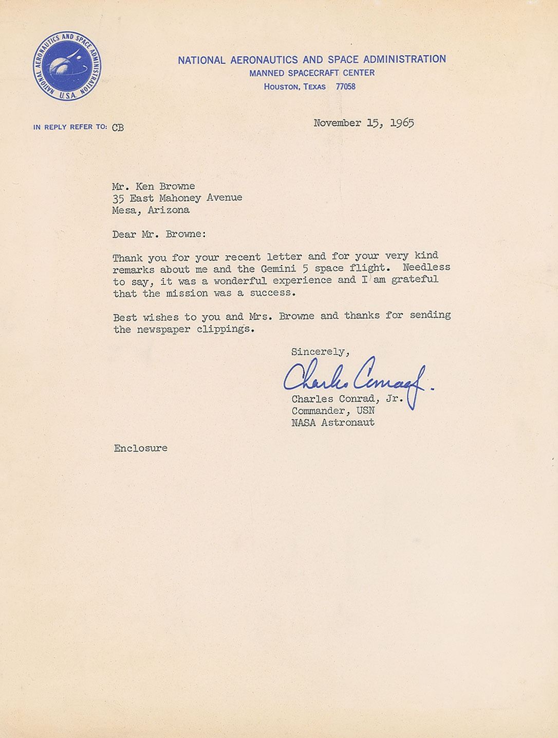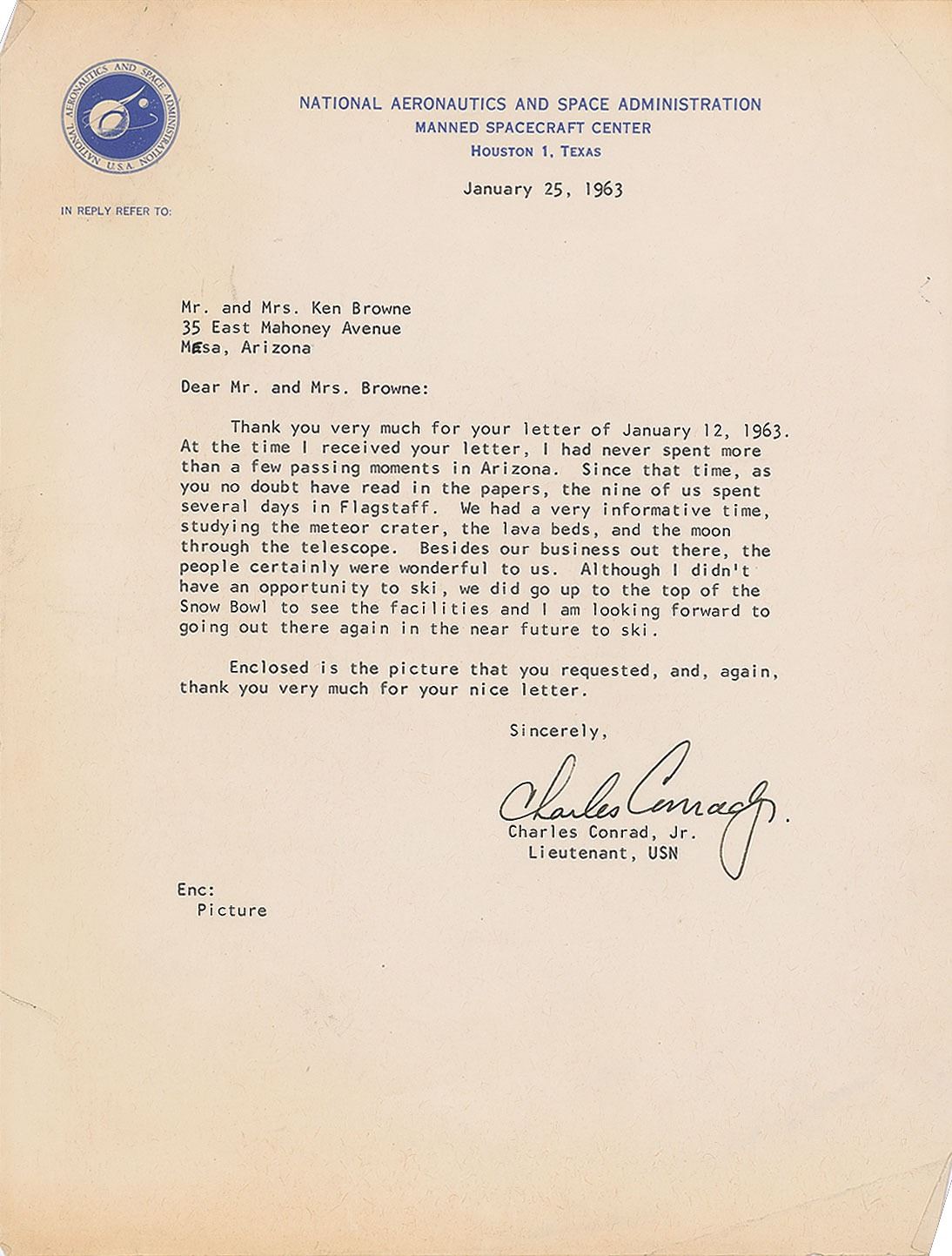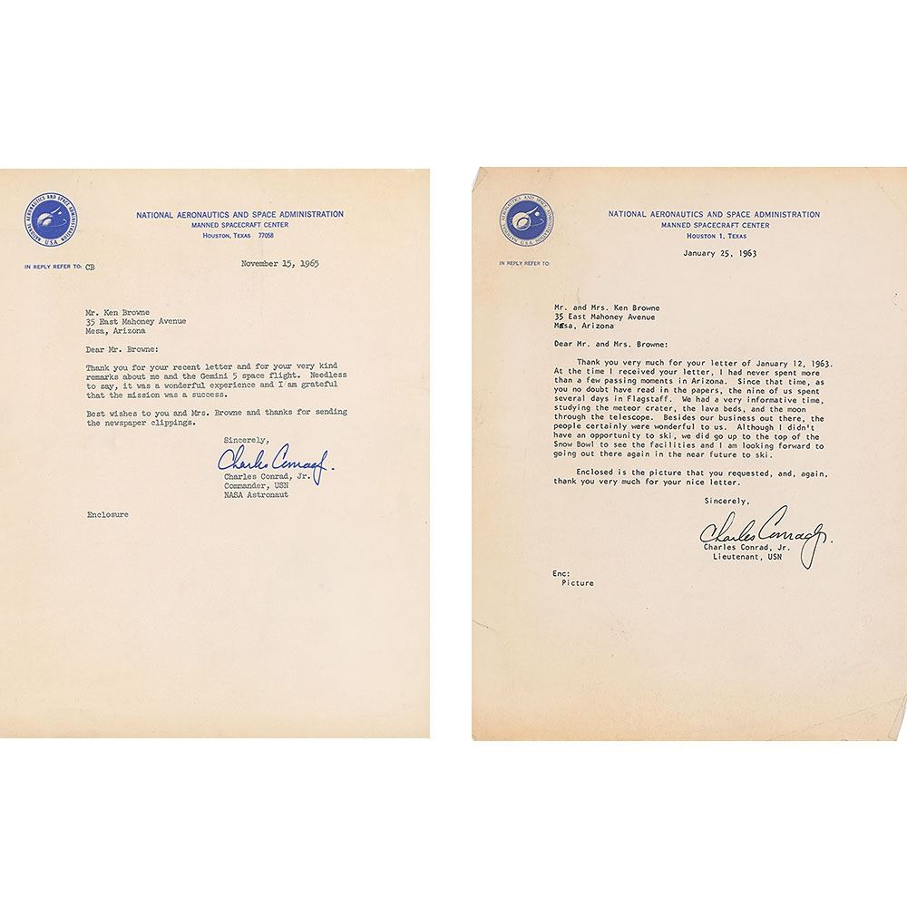 Two TLSs, both signed "Charles Conrad, Jr.," both one page, 8 x 10.5, NASA letterhead, dated January 25, 1963 and November 15, 1965, both addressed to Ken Browne. The earlier letter, in part: "The nine of us spent several days in Flagstaff. We had a very informative time, studying the meteor crater, the lava beds, and the moon through the telescope." The second letter, in part: "Thank you for your recent letter and for your very kind remarks about me and the Gemini 5 space flight. Needless to say, it was a wonderful experience and I am grateful that the mission was a success." In overall fine condition.