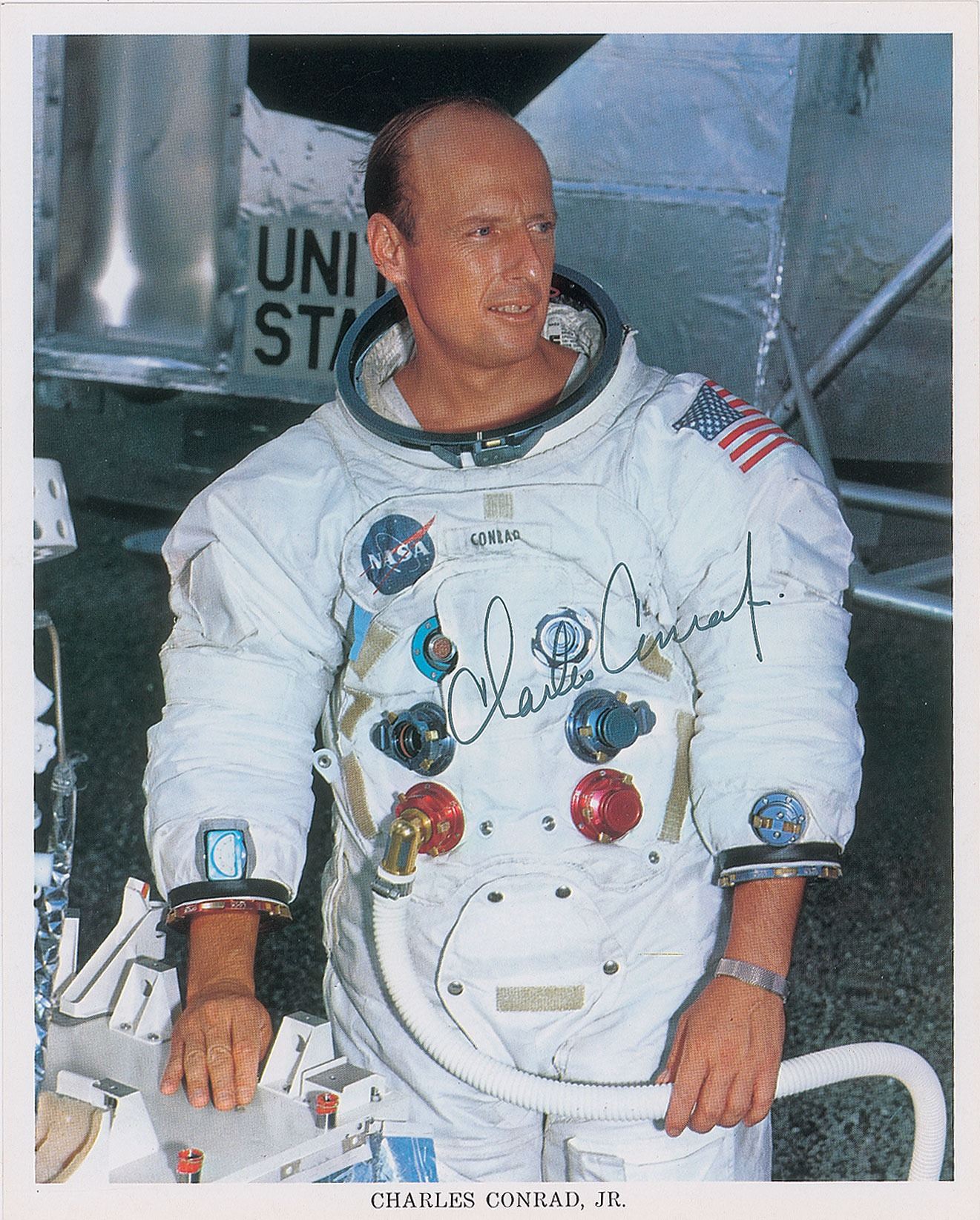 Official color 8 x 10 NASA lithograph of the Apollo moonwalker posing in his white space suit, signed in black felt tip, "Charles Conrad, Jr." In very fine condition. Accompanied by a full letter of authenticity from Zarelli Space Authentication.