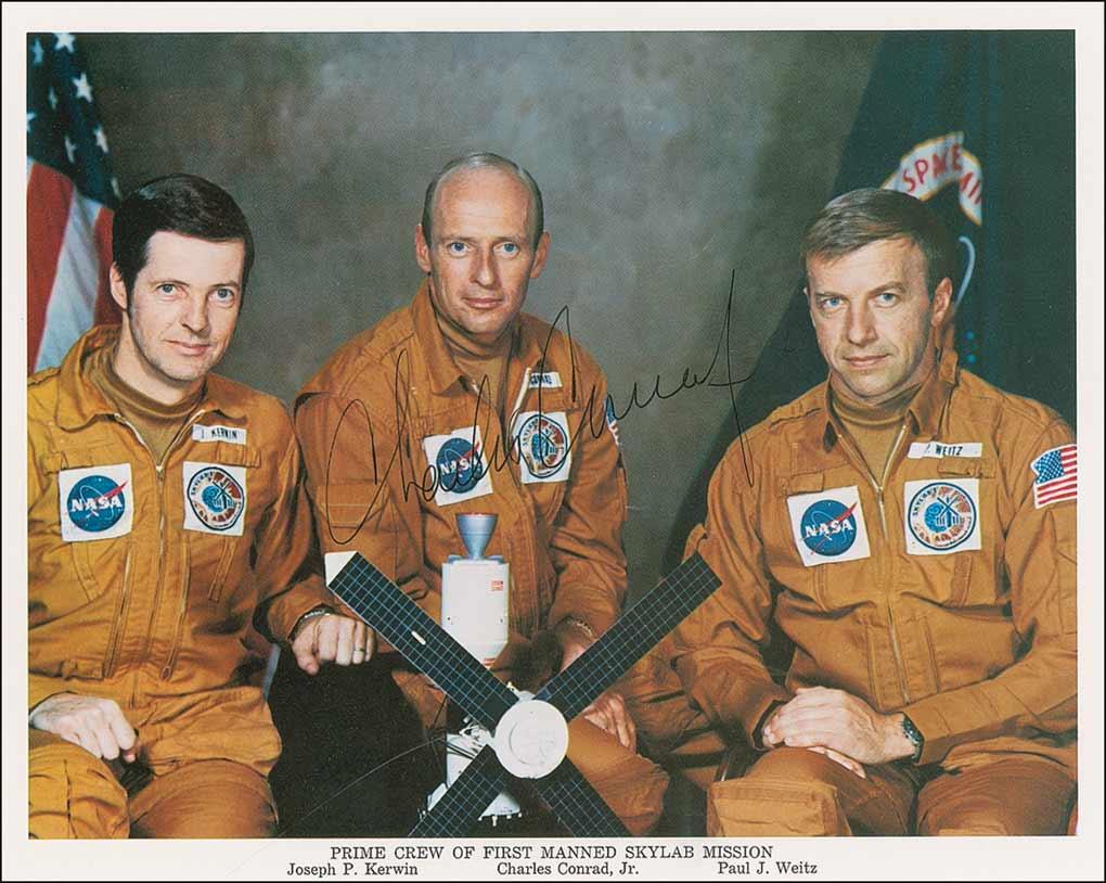 Color 10 x 8 NASA photo of the first prime crew of Skylab, signed in black ink. In fine condition.