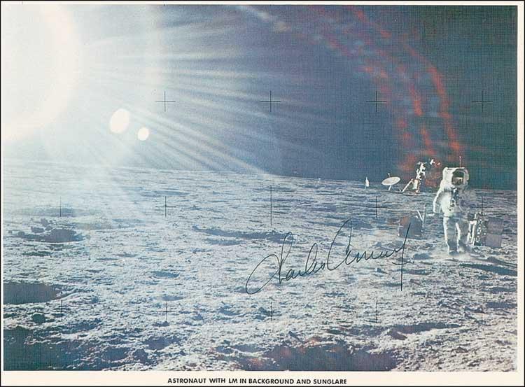 Color 10.75 x 8 photo of Conrad on the lunar surface as the sun rises behind him, signed in black ink. In fine condition, with lightly trimmed bottom edge. Pre-certified Scott Cornish and RRAuction COA.