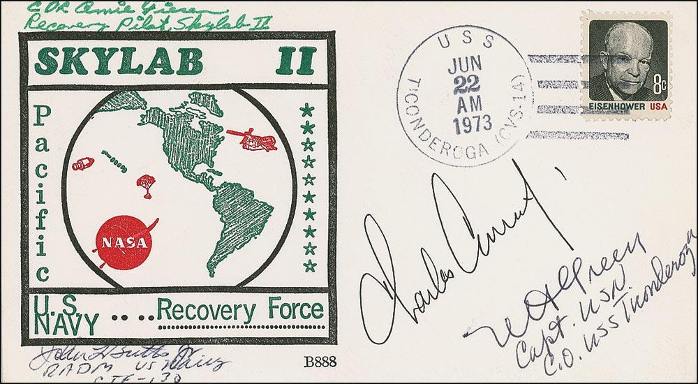 Skylab 2 prime recovery ship postal cover with a cachet honoring the Skylab naval recovery force, signed on the front in black ink by Conrad, and also signed by three recovery officials. In fine condition. Pre-certified Scott Cornish and RRAuction COA.