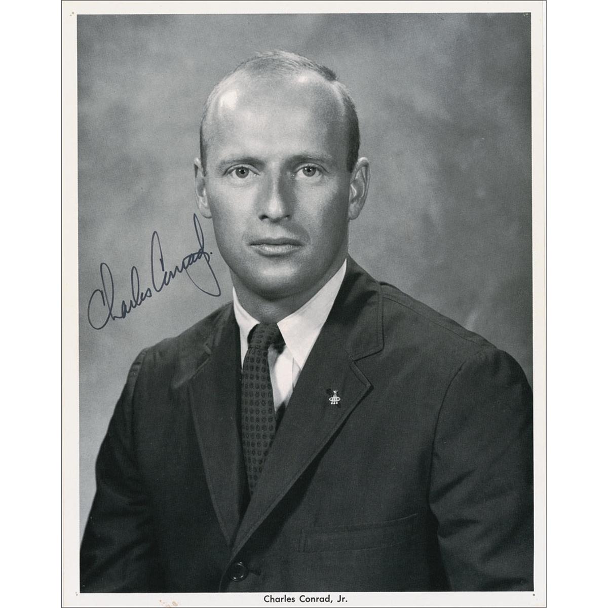 Early 8 x 10 cardstock photo of Conrad dressed in a jacket and tie, signed in black felt tip. In fine condition, with few scattered surface flaws and a tiny spot of soiling at the bottom border.