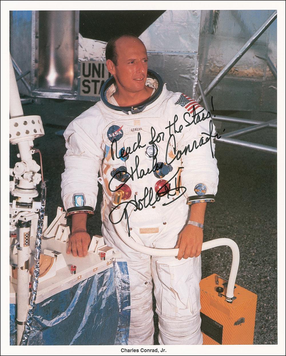 Color 8 x 10 NASA photo of Conrad during training for his moon mission, signed in black felt tip, “Reach for the Stars, Charles Conrad, Apollo XII.” In very fine condition.