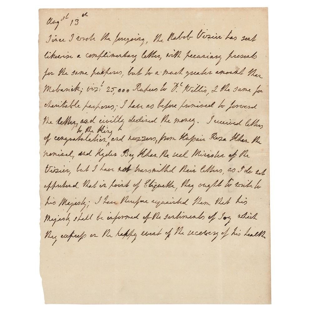 Unsigned partial handwritten letter, one page, 7.5 x 9.75, August 13, [no year]. Partial handwritten letter as Governor-General of India, in part: "Since I wrote the foregoing, the Rabab Vizier has sent likewise a complimentary letter, with pecuniary presents…to a much greater amount than Mabanick; viz. 25,000 Rupees to Dr. Willis, & the same for charitable purposes. I have as before promised to forward the letter and civilly declined the money. I received letters of congratulations to the King…from Hassain Reza Khan…and Kyder Bey Khan the real Minister of the Vizier…I have therefore acquainted them that his Majesty shall be informed of the sentiments of Joy which they express on the happy event of the recovery of his health." In fine condition.