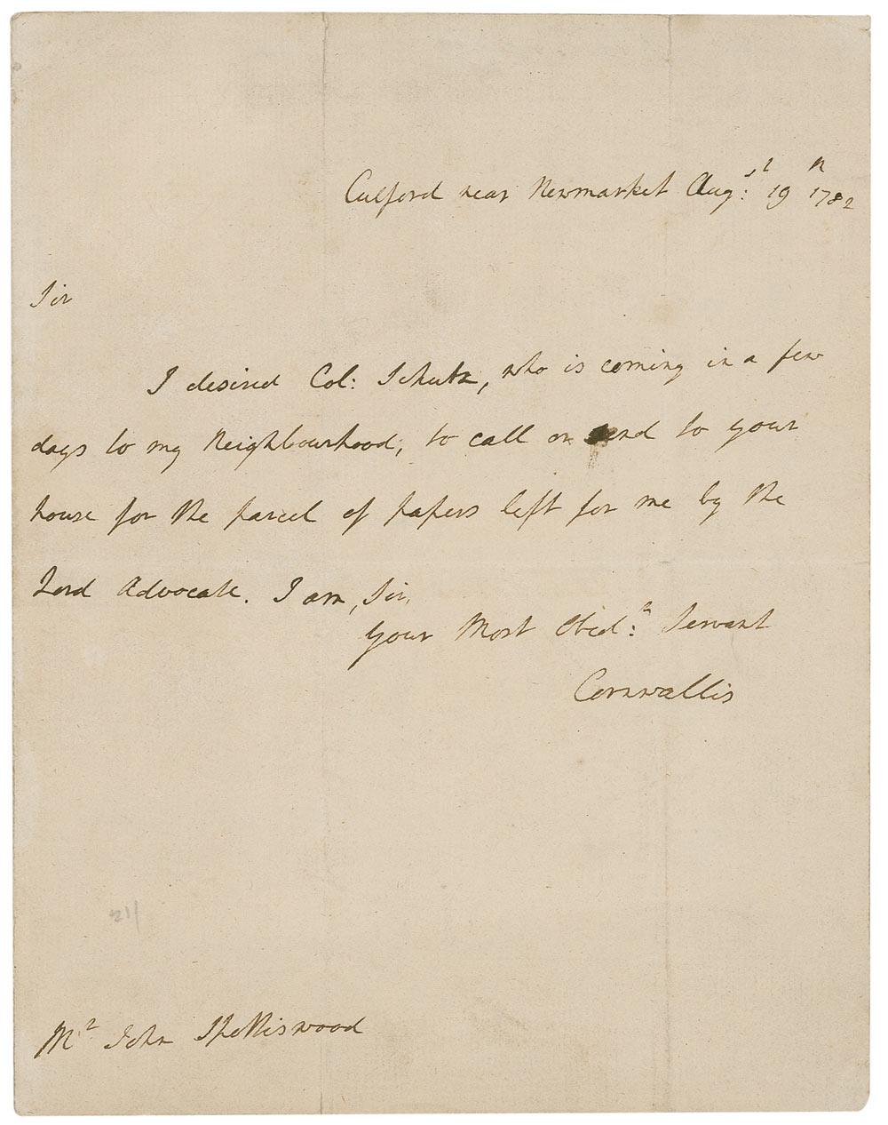 English general (1738–1805) who fought against Washington during the American Revolution and was finally defeated at Yorktown. The crushing defeat aroused much antiwar sentiment in England, and hostilities thereafter tapered off until the final withdrawal of British troops in 1783. ALS signed “Cornwallis,” one page, 7.25 x 9.5, August 19, 1782. Letter to a gentleman. In full: “I desired Col. Schutz, who is coming in a few days to my neighbourhood, to call or send to your house for the parcel of papers left for me by the Lord Advocate.” Intersecting folds, one through a single letter of signature, scattered soiling, and a uniform shade of mild toning, otherwise fine condition.