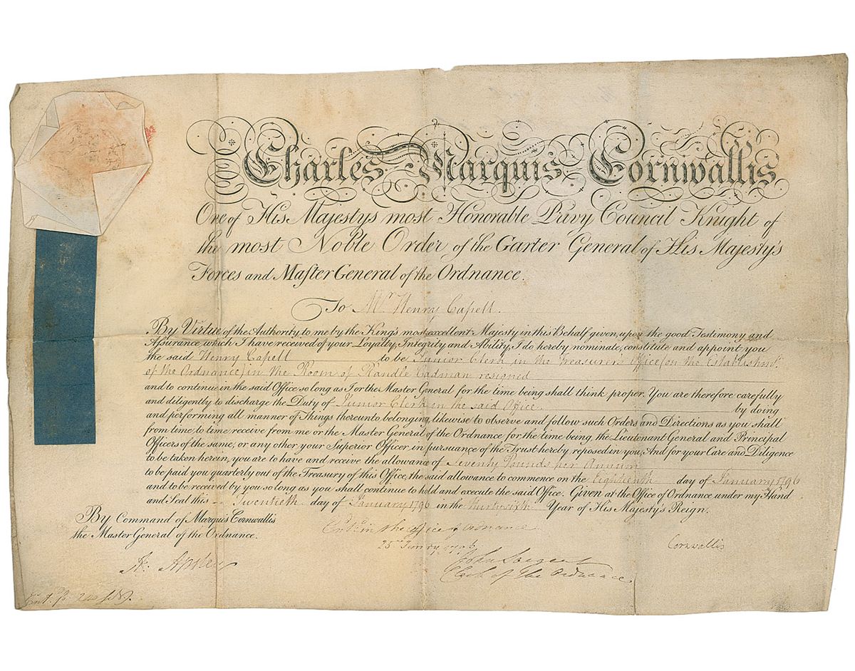 British general (1738–1805) who served in America from 1776 to his surrender at Yorktown in 1781. Partly-printed vellum DS, signed “Cornwallis,” one page, 16.5 x 10.5, January 18, 1796. Cornwallis appoints Henry Capell to be “Junior Clerk in the Treasurer’s Office (on the Establishm’t of the Ordnance) in the Room of Randle Cadman resigned.” Signed in the lower right by Cornwallis and countersigned by two other officials. The white paper seal and blue ribbon affixed to the upper left remain intact with scattered creases. In very good condition, with intersecting folds (a few small tape-repaired edge separations), scattered creases and soiling, and the overall writing and signature a shade light.