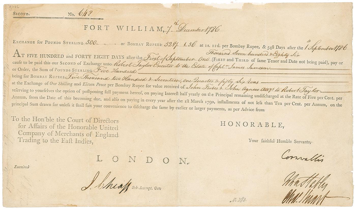 English general (1738–1805) who fought against Washington during the American Revolution and was finally defeated at Yorktown. The crushing defeat aroused much antiwar sentiment in England, and hostilities thereafter tapered off until the final withdrawal of British troops in 1783. Partly-printed DS, signed “Cornwallis,” one page, 14 x 8.25, December 7, 1786. Cornwallis orders the payment of 500 pounds sterling to Robert Taylor, Executor to the Estate of Captain James Jameson. Signed at the conclusion by Cornwallis, and countersigned by two others. Document has been professionally backed. In very good condition, with three vertical folds, slight paper loss to top edge, notations along left edge, and mild toning. A nicely signed example from Cornwallis’s post-Revolutionary War career.