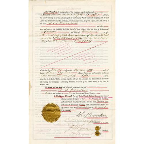 <B>Charles Crocker Document Signed</B></I> "<I>Cha. Crocker.</B></I>" This 8.5" x 14" document was signed by Crocker on the 13th of August, 1884. The document is two pages, and printed on both sides. It is a Central Pacific Railroad Company deed for 160 acres of land bought by A.B. Driesbach. Driesbach paid $480.00 for the land. Crocker signs his name on the reverse of the first page, as second vice president of the Railroad. Crocker was largely responsible for heading the construction of the Central Pacific Railroad, and spending exorbitant amounts of money doing so. He was a well-respected man in his adopted state of California, and even served as alderman for the new Republican Party, supporting John C. Fremont's run for the presidency. Even though Fremont was unsuccessful, Crocker was elected to state assembly. He became one of Sacramento's leading citizens. Having played a large part in the uniting of the coast via the railroad. Crocker's signature is a valuable and interesting part of this country's history. Hammer your bid down on this lot today!