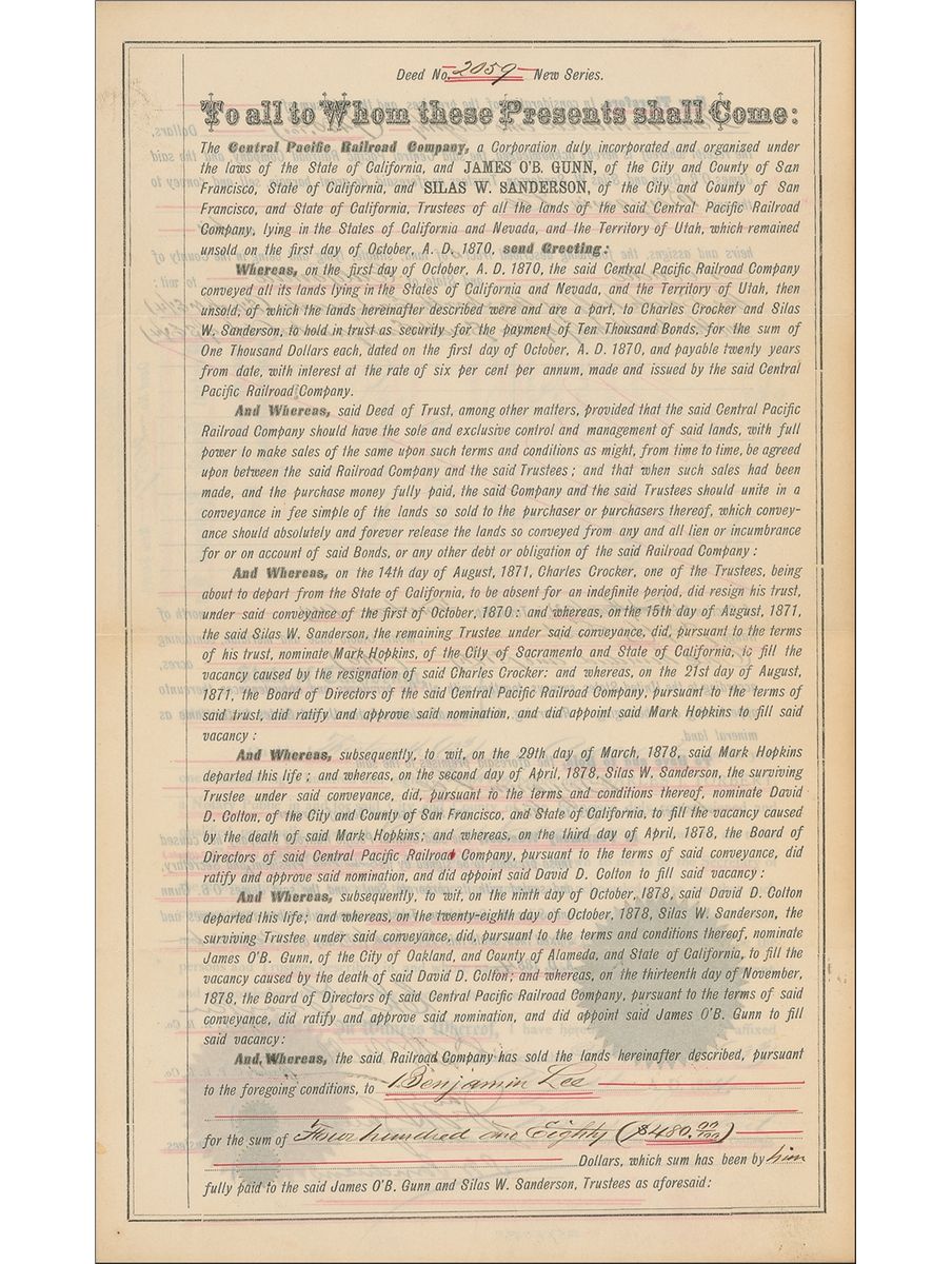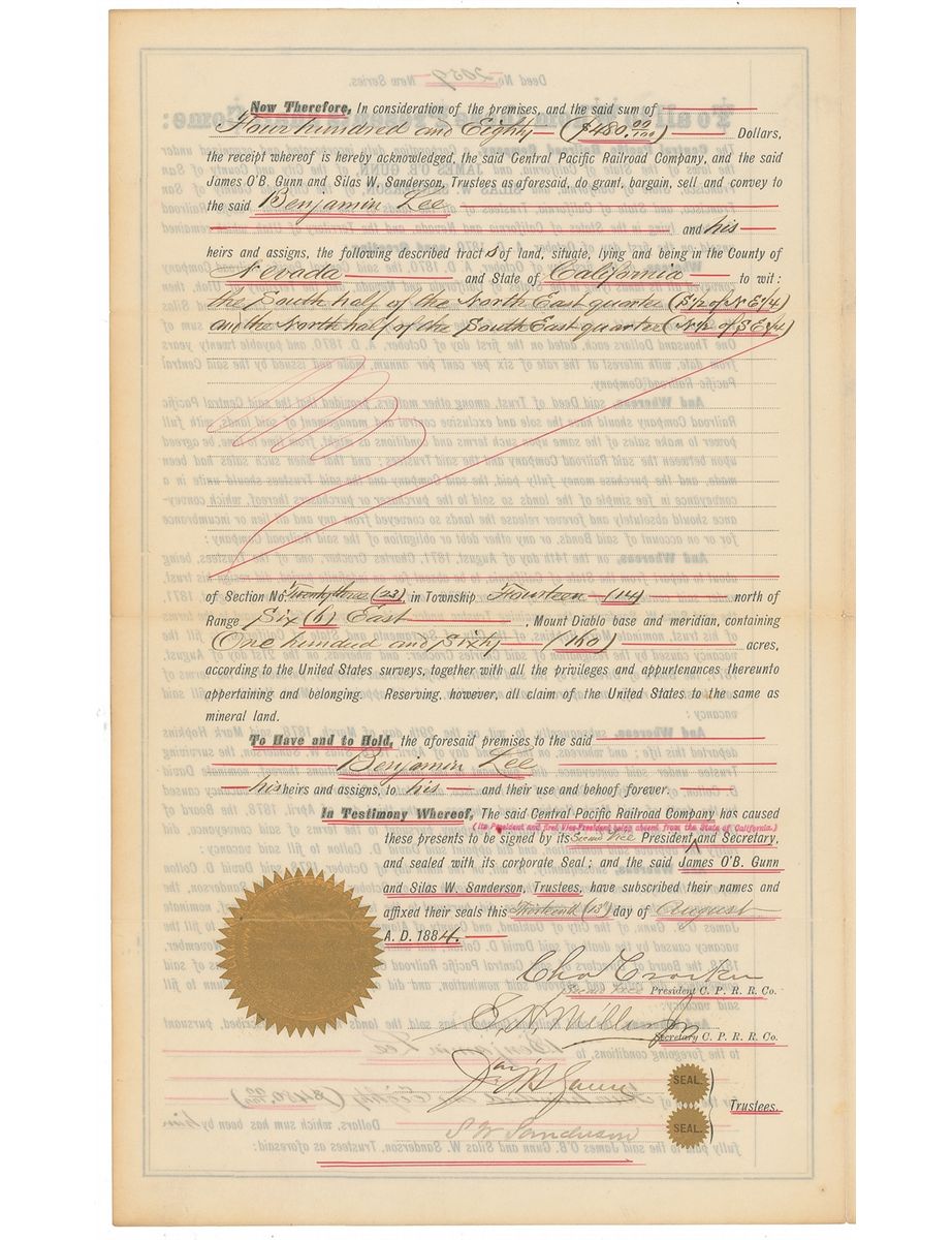 Transcontinental Railroad founder (1822–1888). DS, signed “Cha Crocker,” two pages both sides, 8.5 x 14, August 13, 1884. A quitclaim deed between the Central Pacific Railroad and John B. Hicken for the sum of $480.00, signed on the reverse by Crocker as the railroad’s president. In fine condition, with some scattered light toning to all sides.